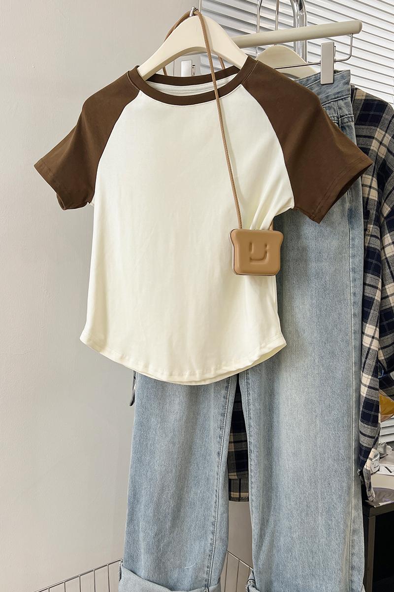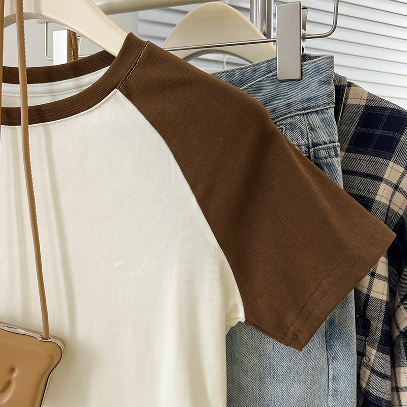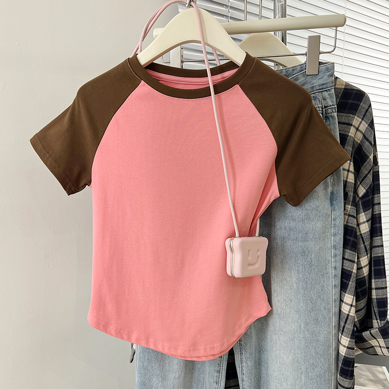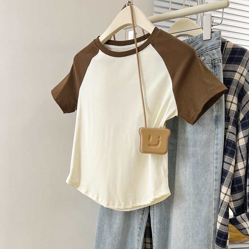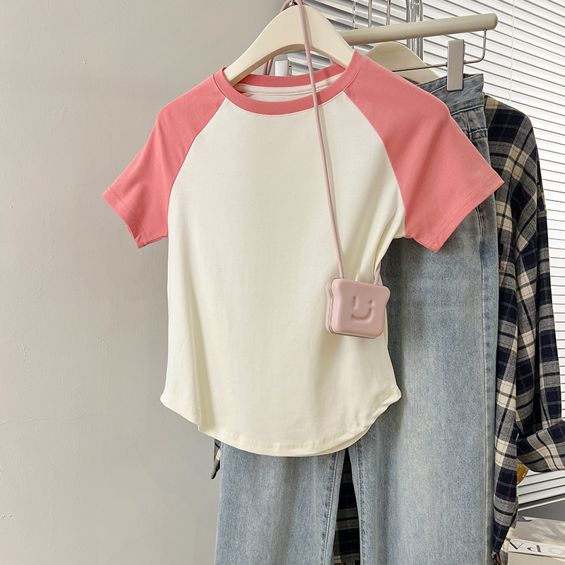 진짜 가격 실제 샷 #Apricot 컬러 라글란 슬리브 순수면 어깨 짧은 슬리브 티셔츠 여름 미국 아메리카 아메리카 작은 짧은 탑