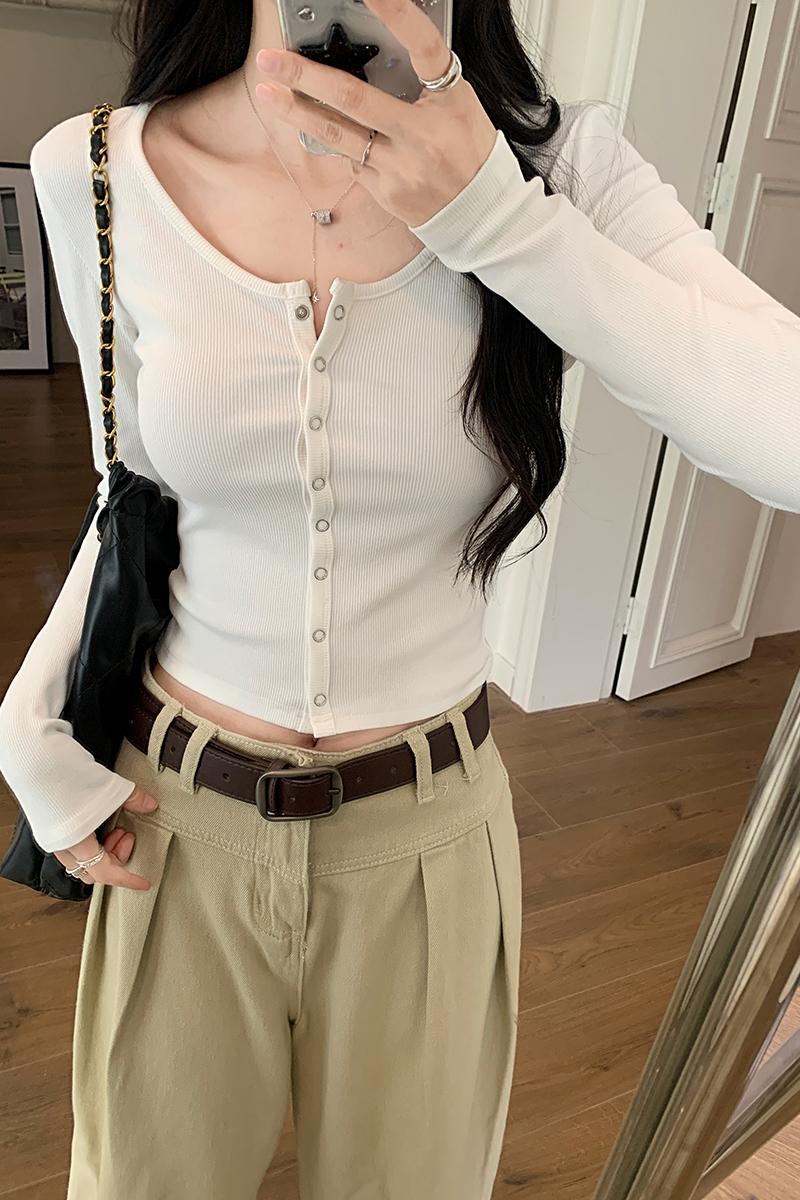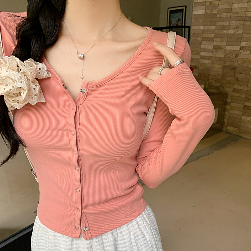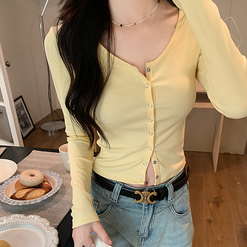 White V-Neck, 앞쪽 어깨, 봄과 가을에 여성을위한 긴팔 티셔츠 짧은 상단이있는 새로운베이스 셔츠