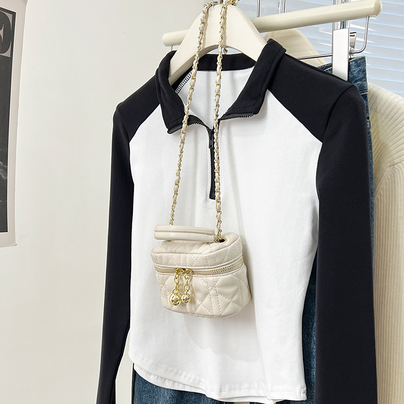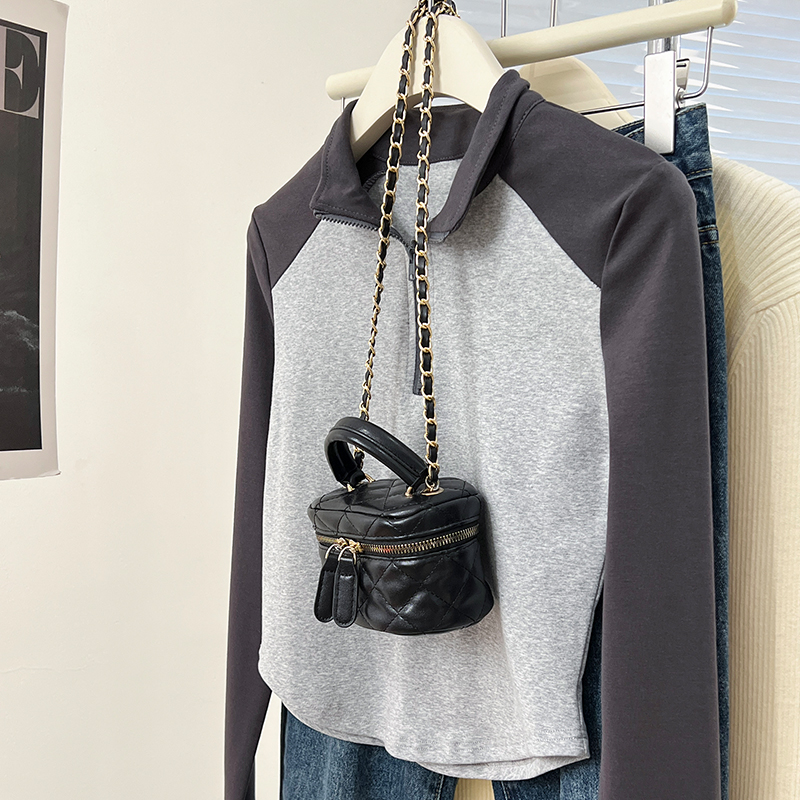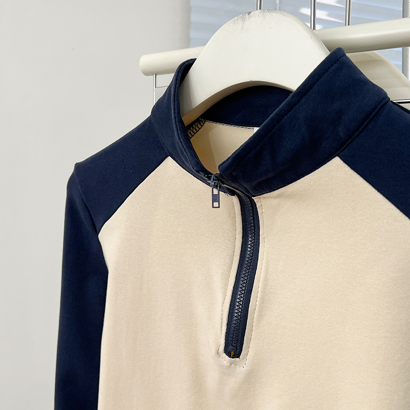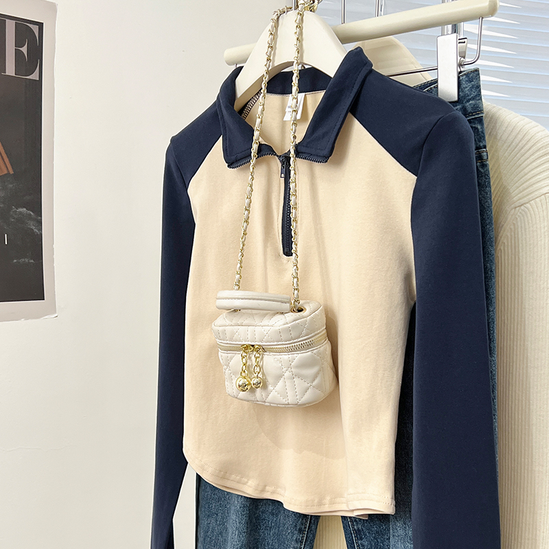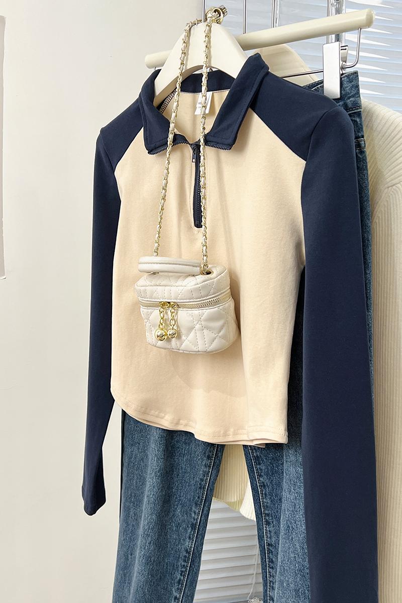 Real-Price Real-Life Shot #American Retro Stand Collar Half Half Gizper Raglan Sleeves T-Shirt 여성 긴팔 가을 디자인 짧은 탑