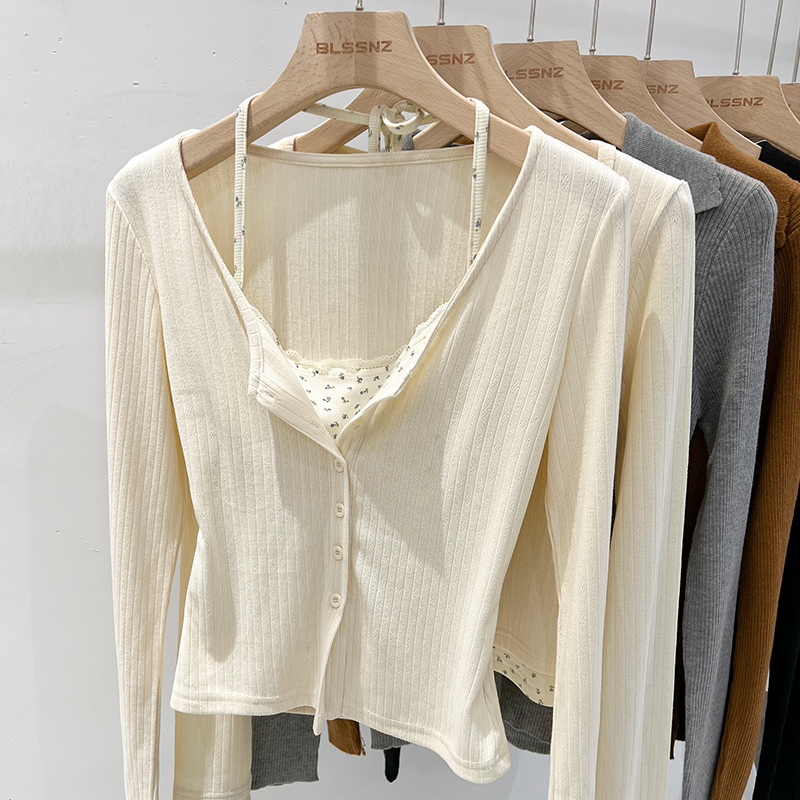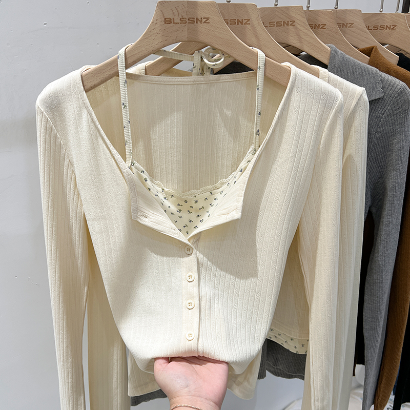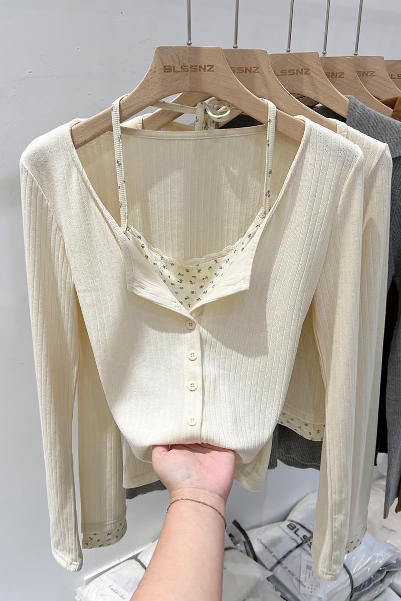 실제 가격 실제 샷 #Lace Floral Fake 2 피스 고삐 목 봄과 가을베이스 셔츠에있는 여성을위한 긴팔 티셔츠 짧은 상단 내부