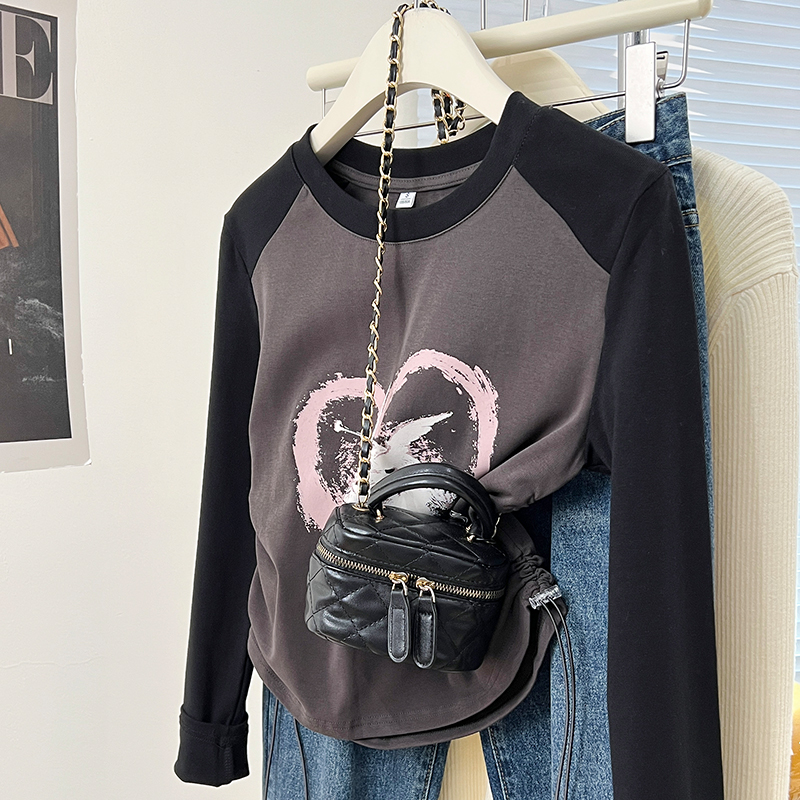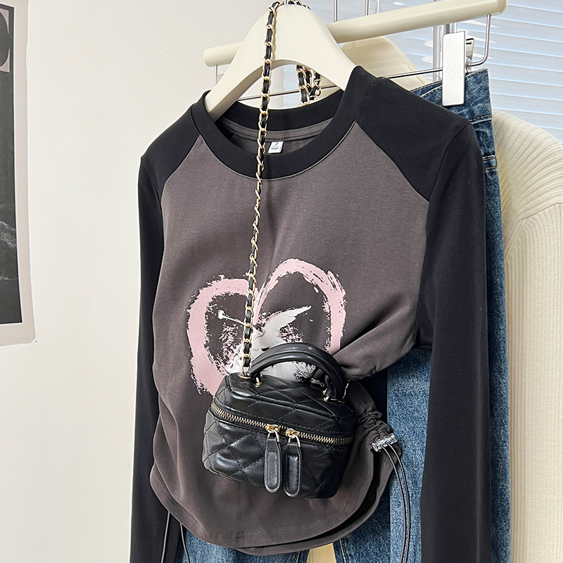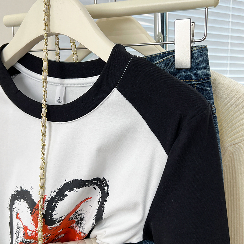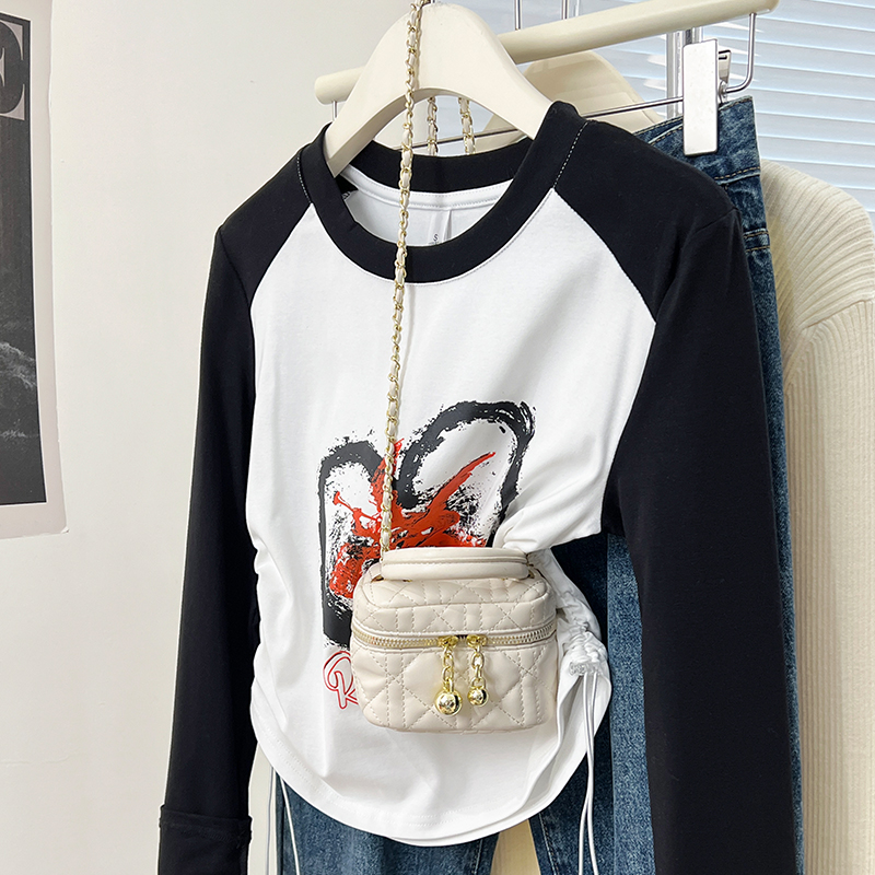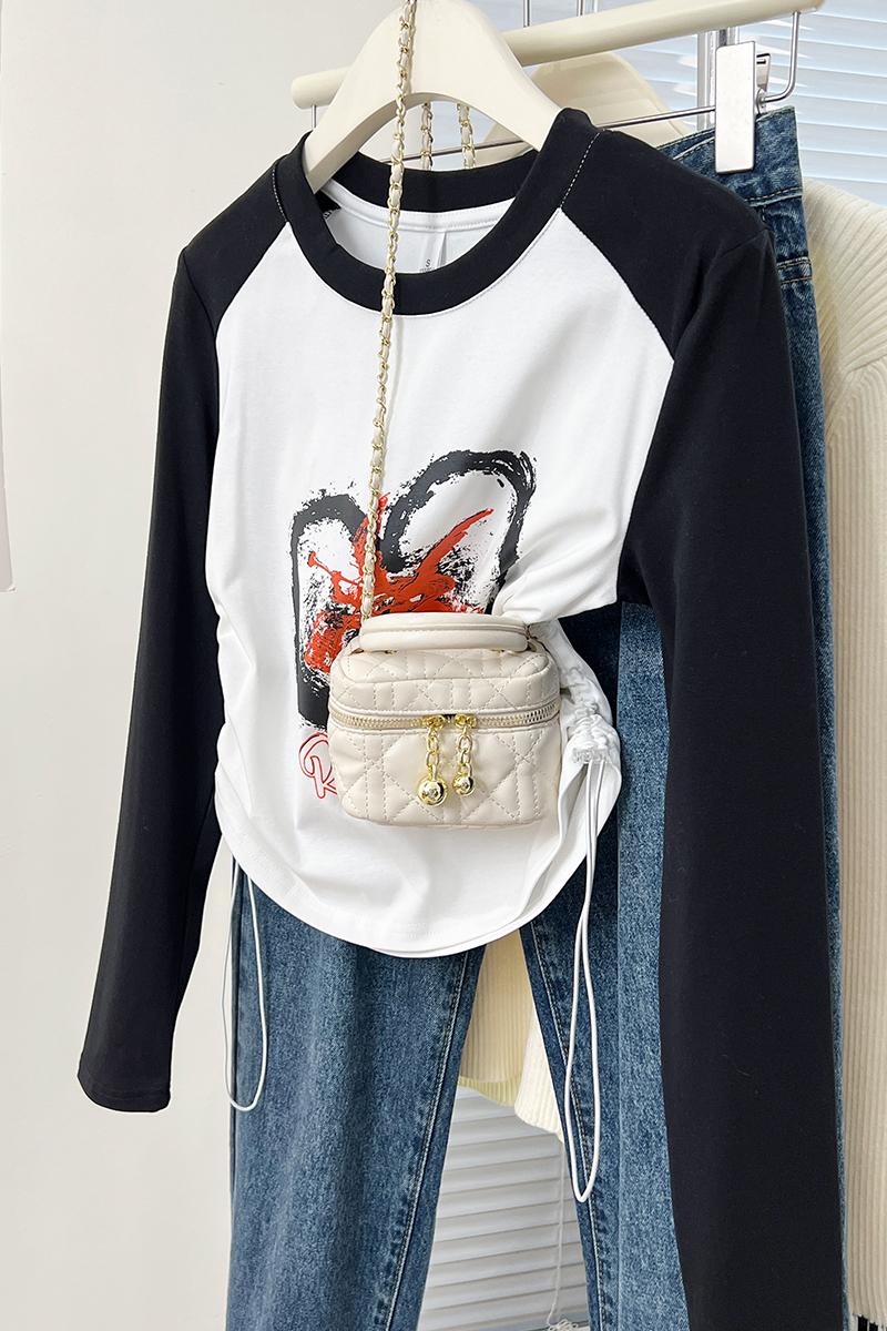 Real-Price Real Shot #DrawString American Retro Raglan Sleeve Women 's Spring Base Shirt Short Top Trendy를위한 긴팔 티셔츠