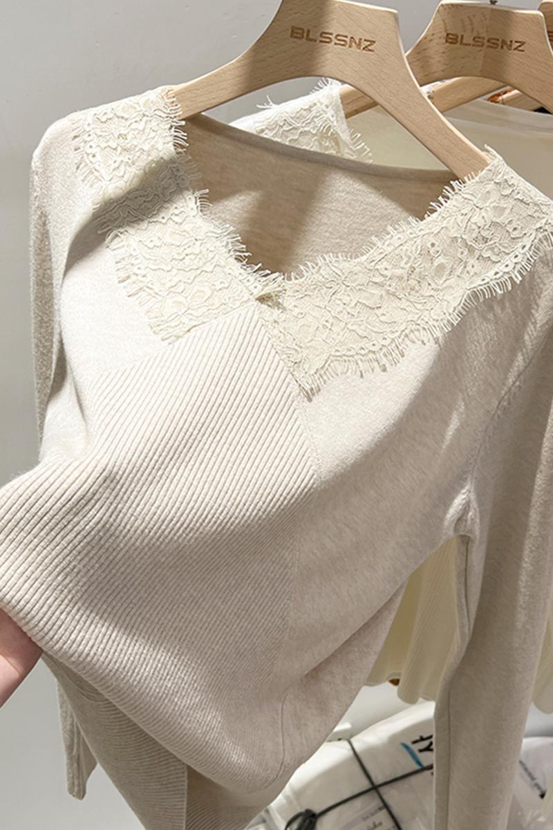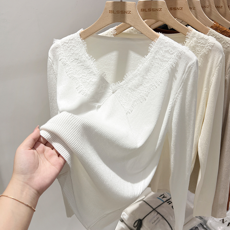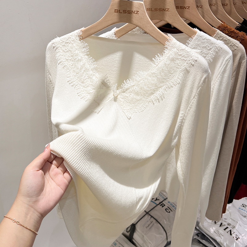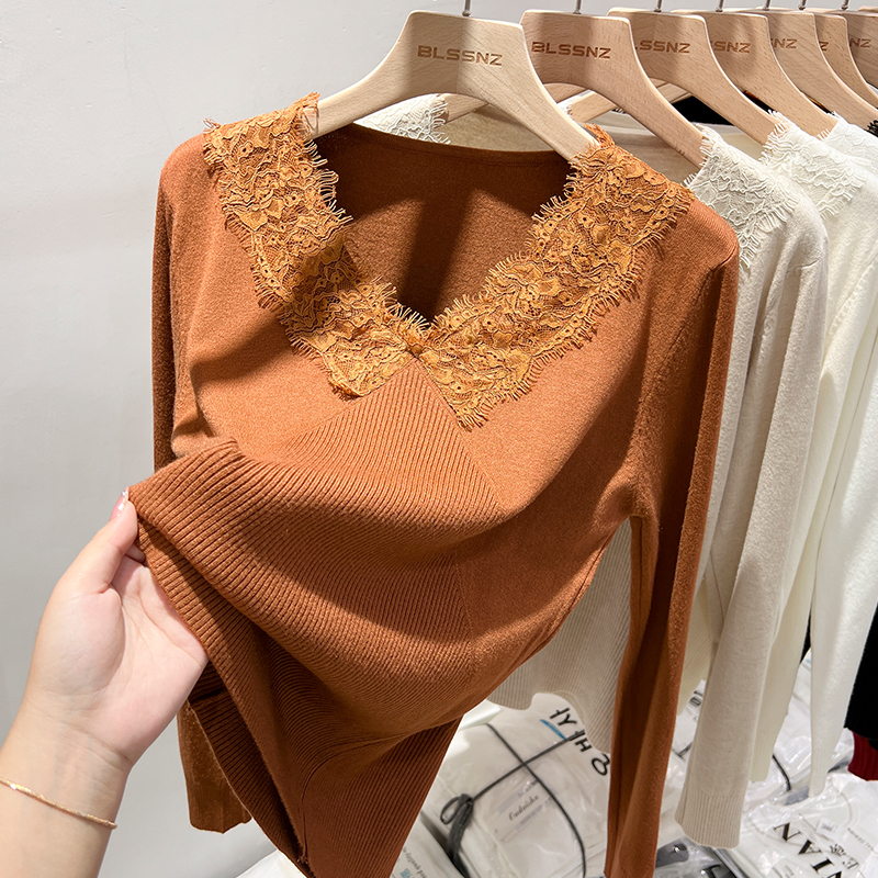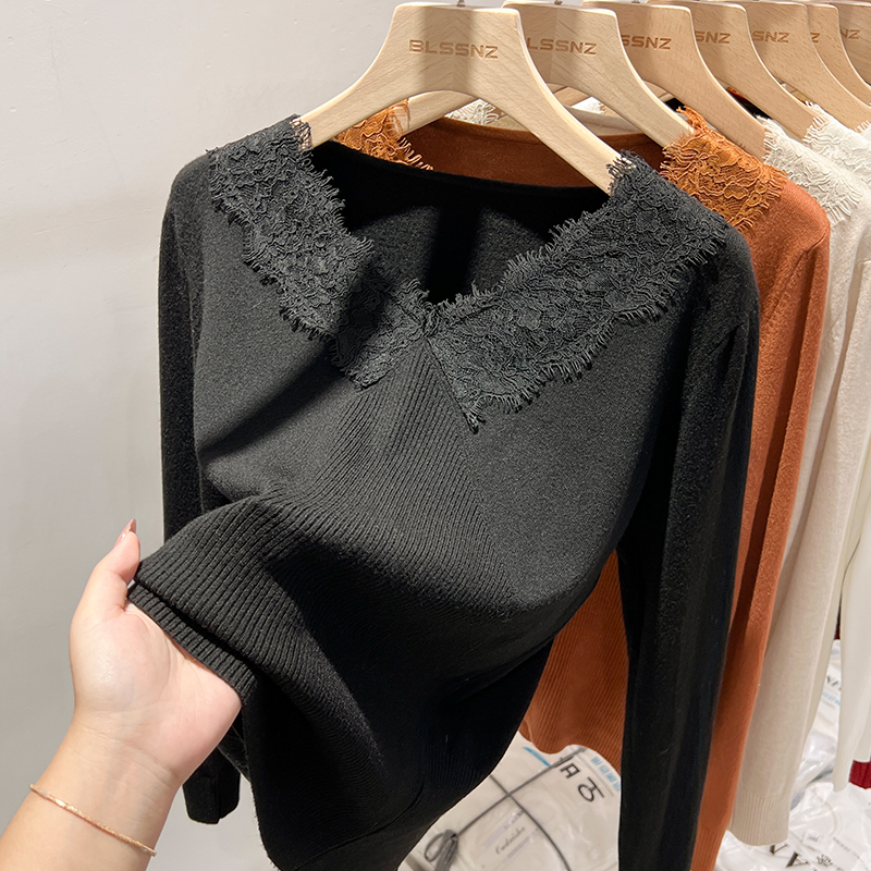 실제 가격 실제 샷 #lace v-neck 니트베이스 셔츠 가을과 겨울 디자인과 두꺼운 스웨터 독특한 트렌드를 가진 여성을위한 니트베이스 셔츠