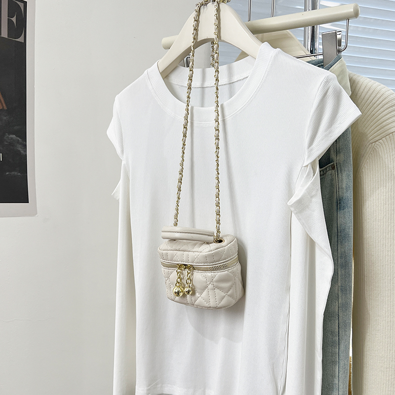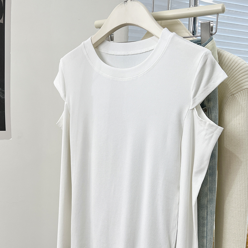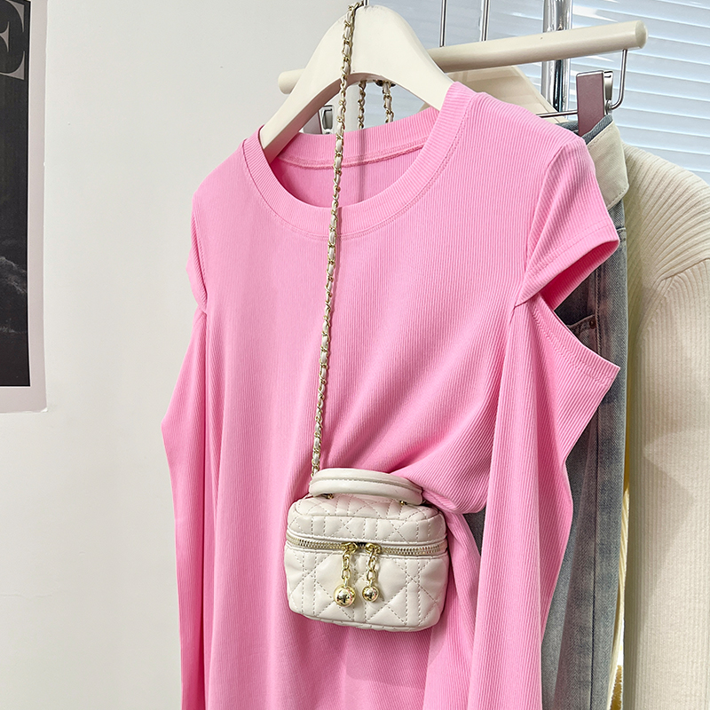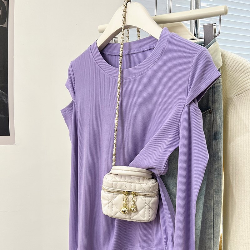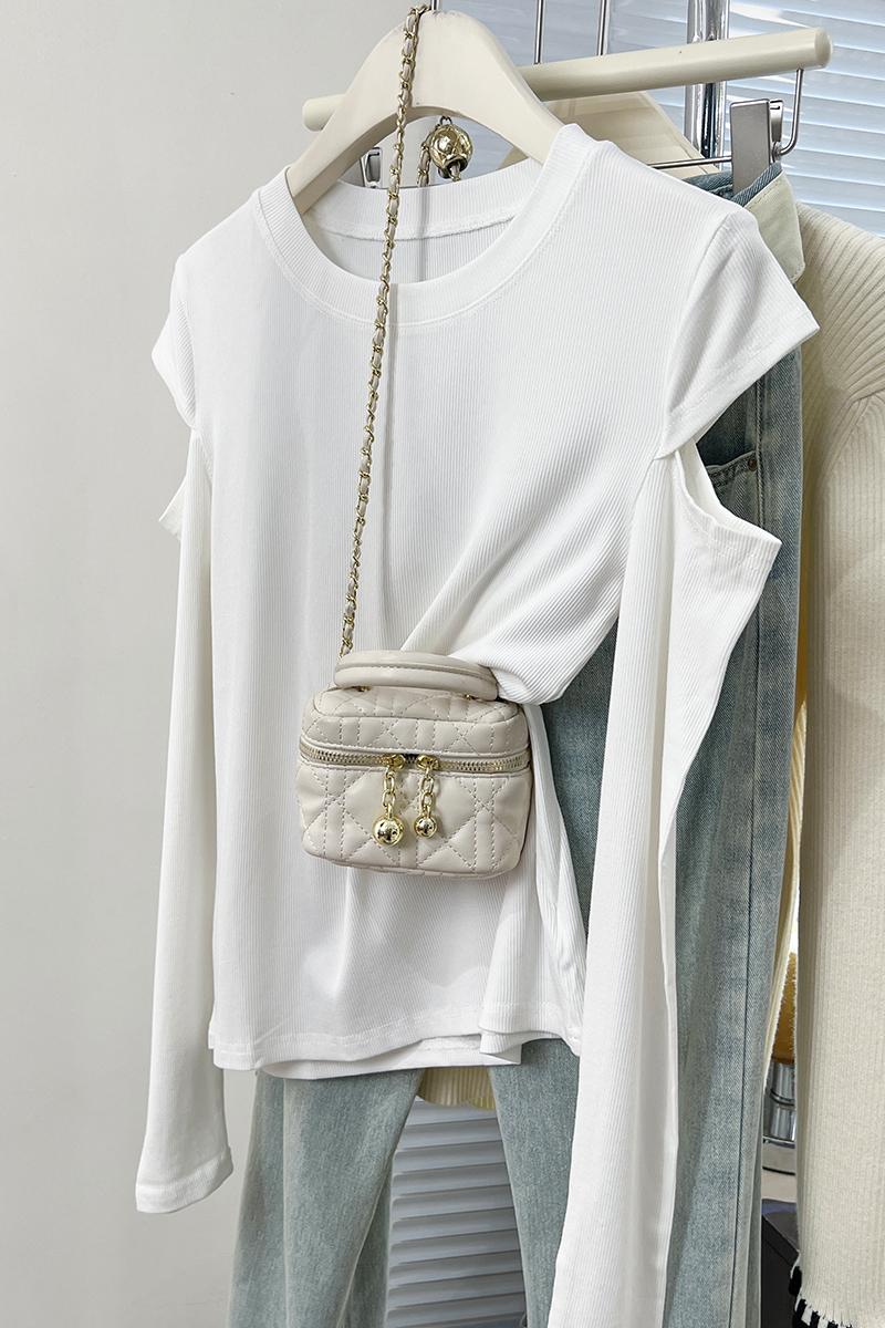 Real-Price Real Shot #Wholl Hollow 오프 숄더 봄과 가을 디자인 여성을위한 긴팔 티셔츠 틈새 틈새 느슨한베이스 셔츠