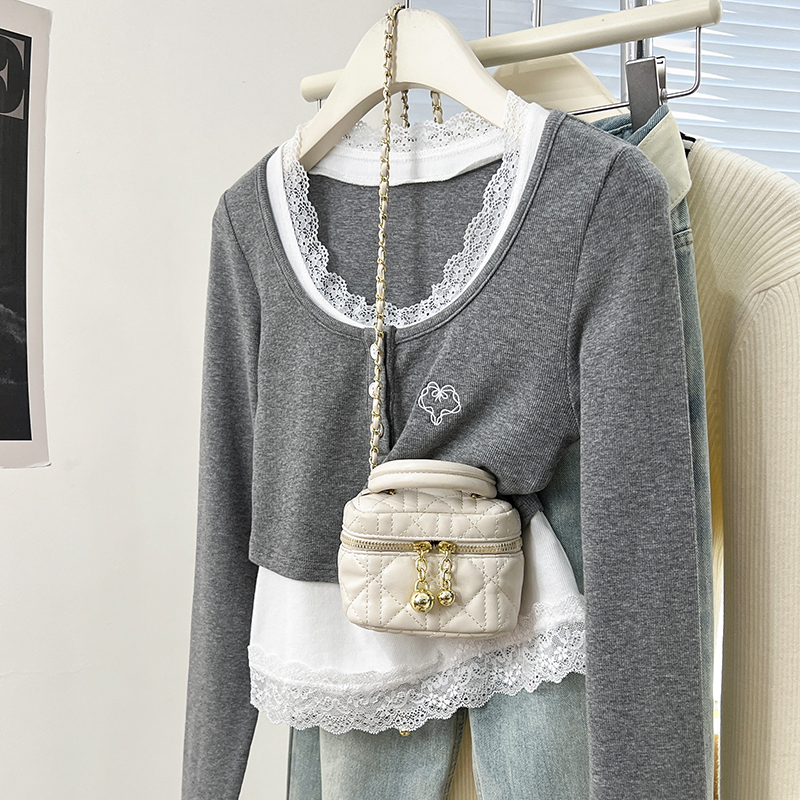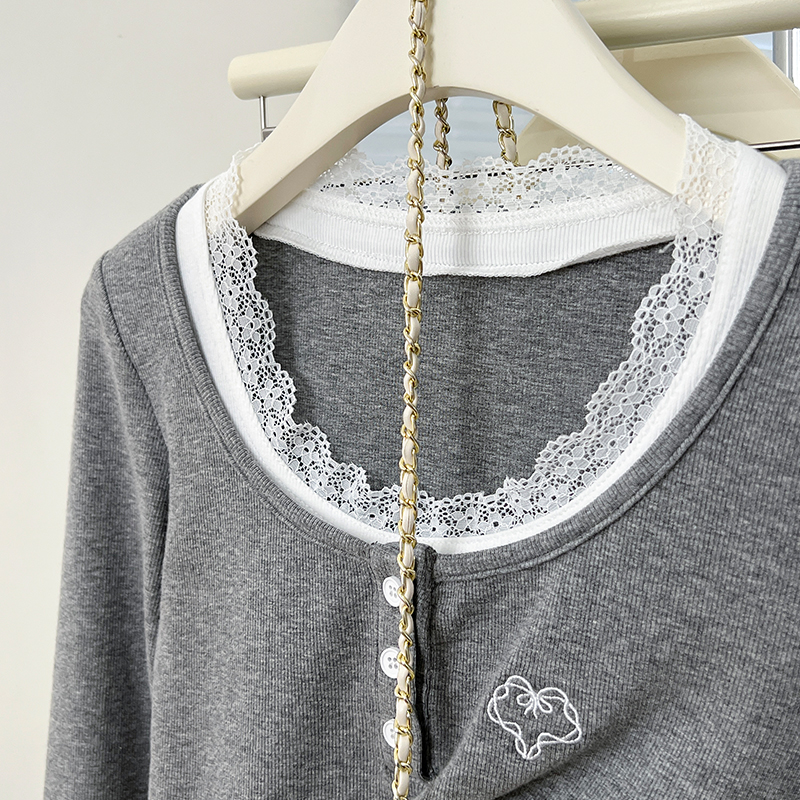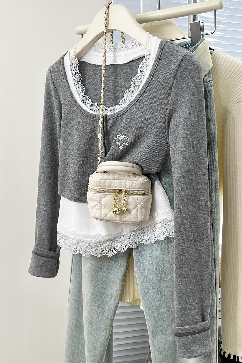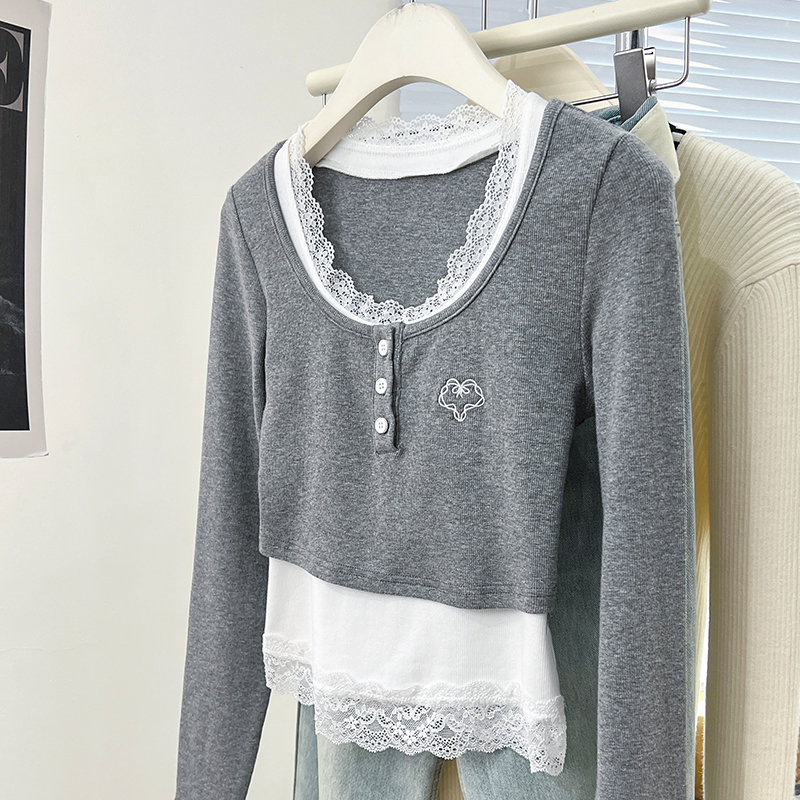 Real Price Real Shot #Grey Lace 가짜 2 피스 어깨 u 넥 긴팔 티셔츠 여자 스프링베이스 셔츠 짧은 탑
