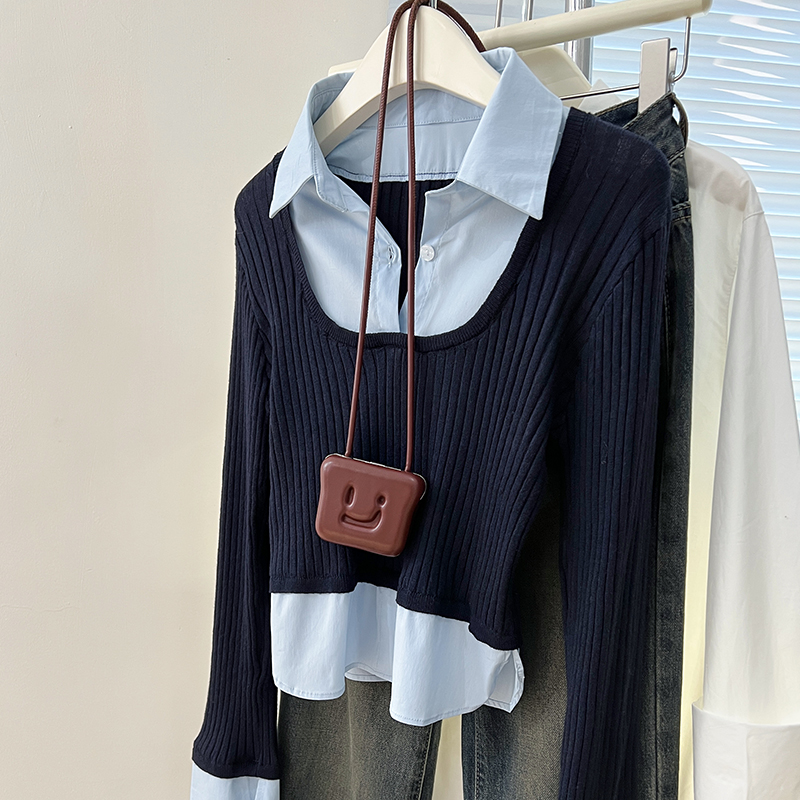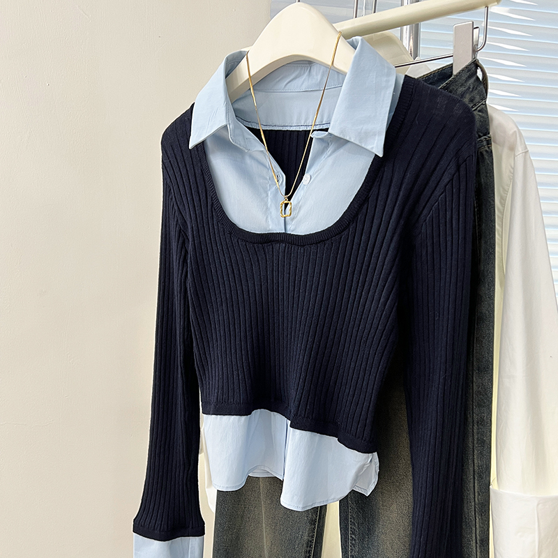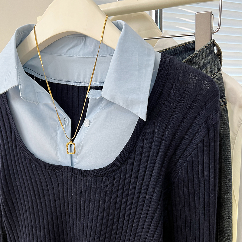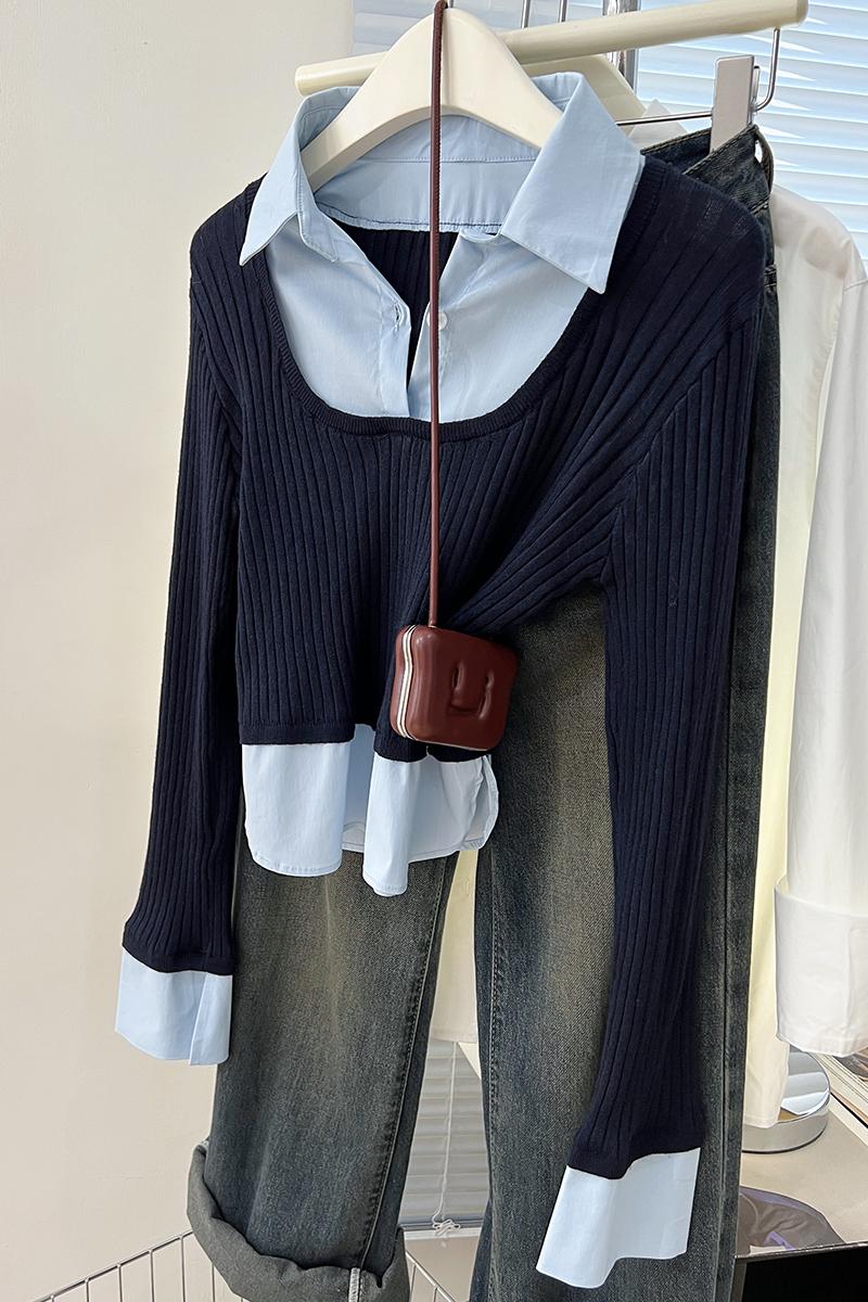 실제 가격 실제 샷 #파이크 ​​2 피스 블루 셔츠에서 여성을위한 가을 디자인 프렌치 셔츠 재킷 긴 슬리브 니트 탑
