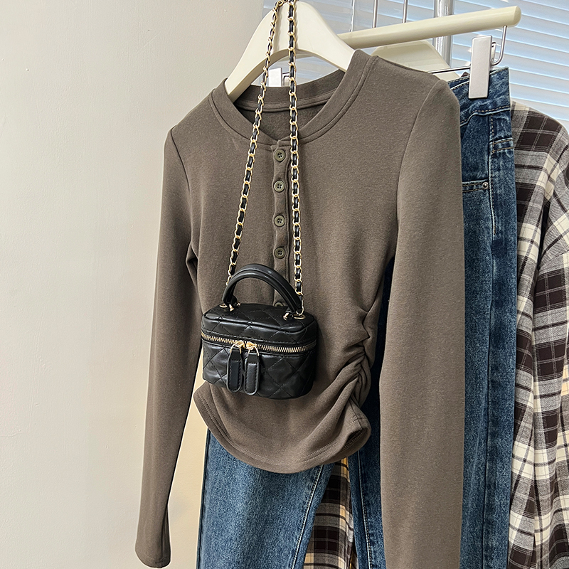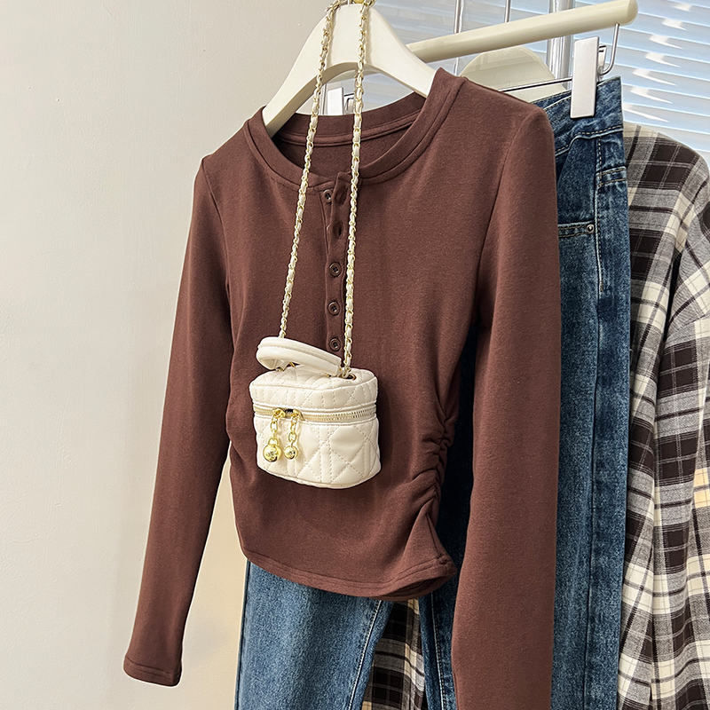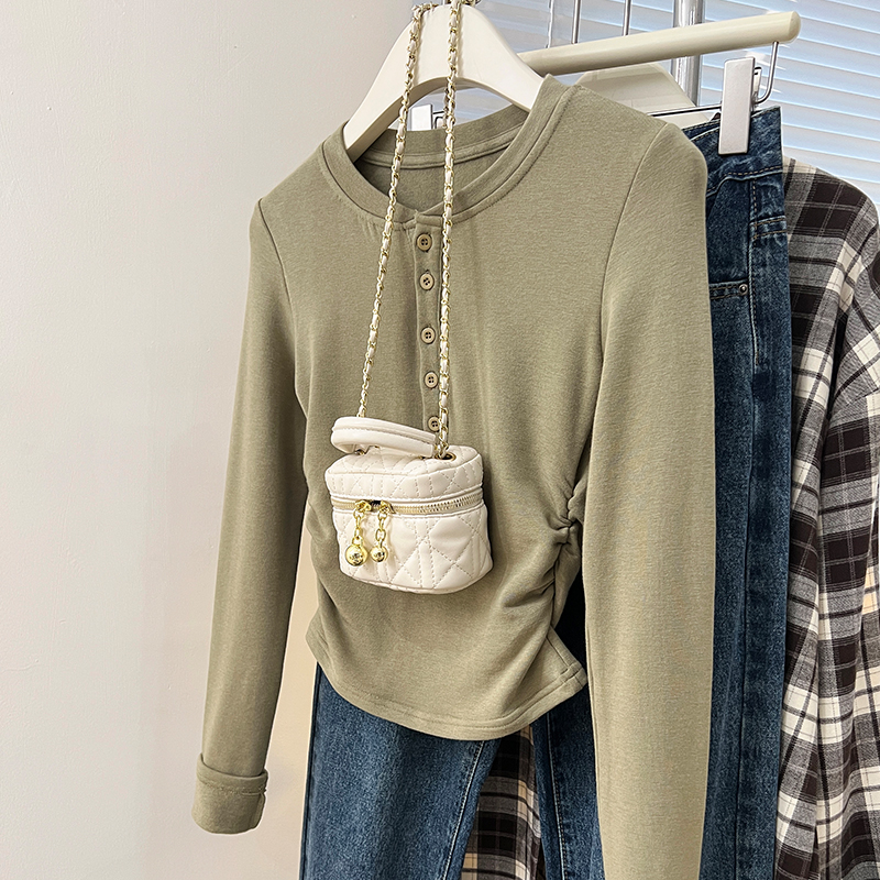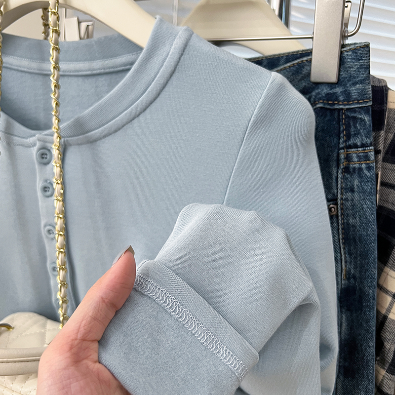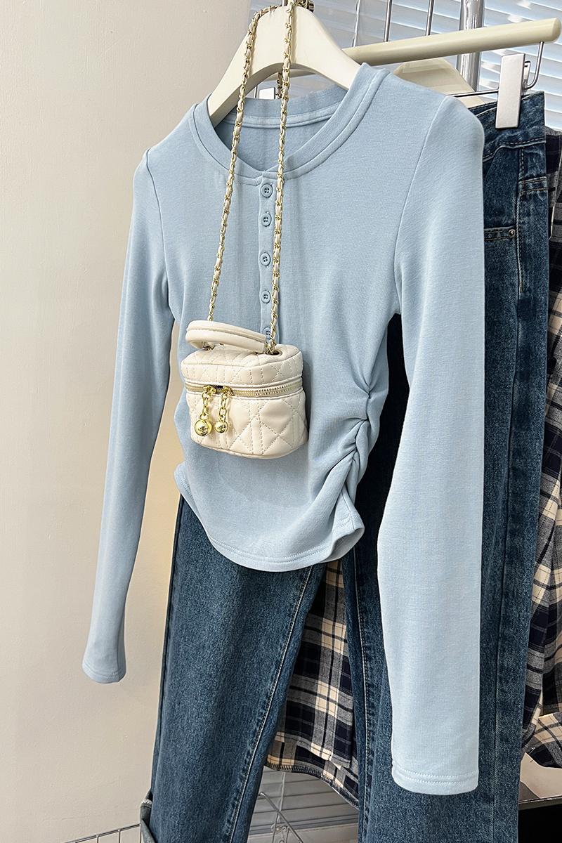 Real-Price Real Shot #Blue 가을과 겨울 디자인 틈새 기본 셔츠를 입은 여성을위한 짧은 불규칙한 면화 긴팔 티셔츠