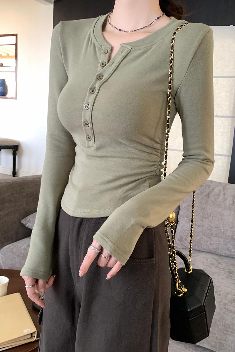 실제 가격 실제 샷 #Green 짧은 불규칙한 면화 긴팔 티셔츠 가을과 겨울 디자인 틈새 기본 셔츠 탑