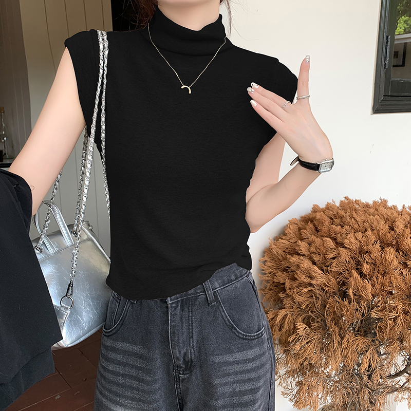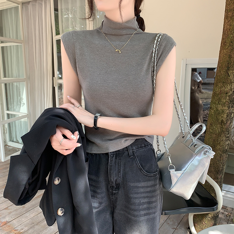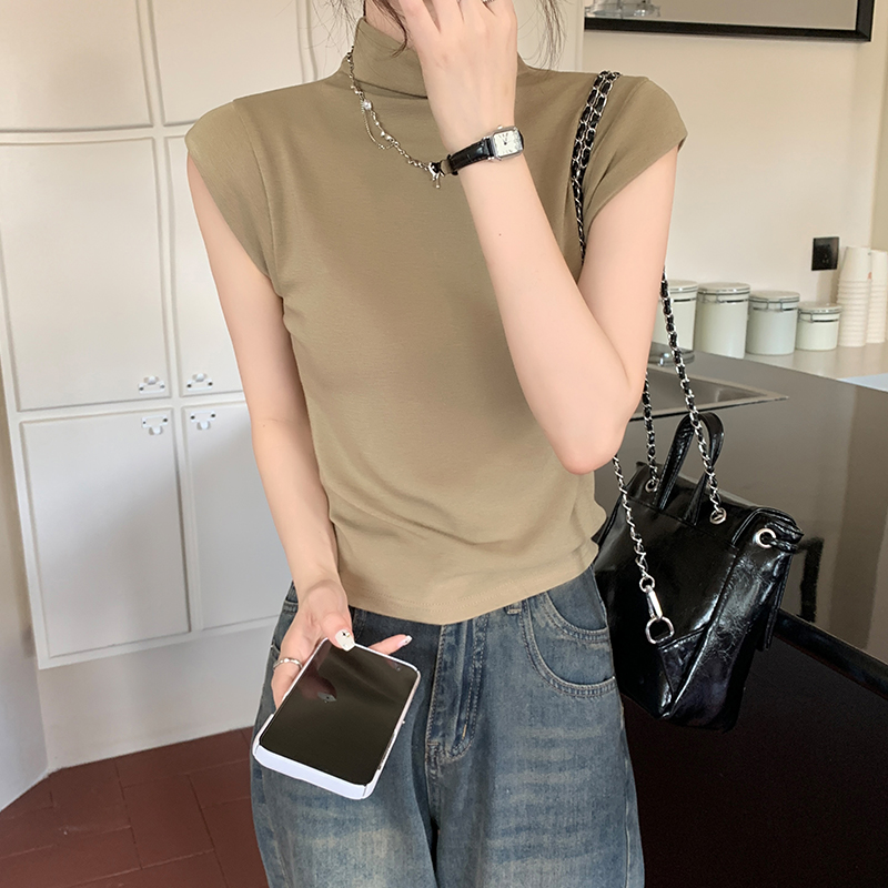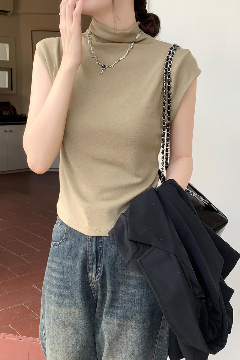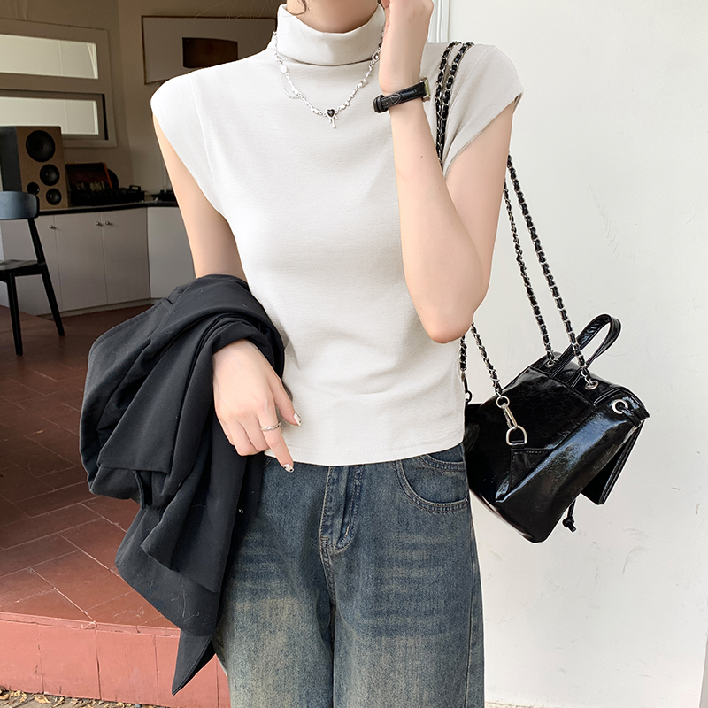 실제 가격의 실제 샷 #EUROPEAN High-Neck Sleeveless 티셔츠 여름에 여성을위한 새로운 회색 작은 플라잉 슬리브 슬림 한 짧은 탑