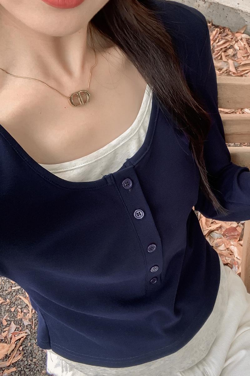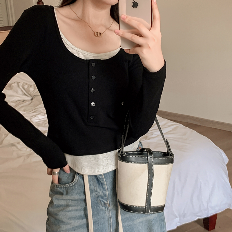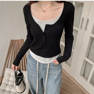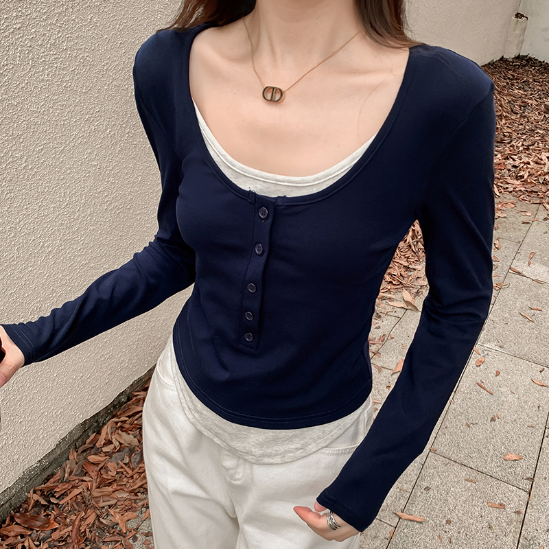 유럽 장점 티셔츠 새로운 가짜 2 피스 짧은 스퀘어 칼라 탑베이스 셔츠 트렌디