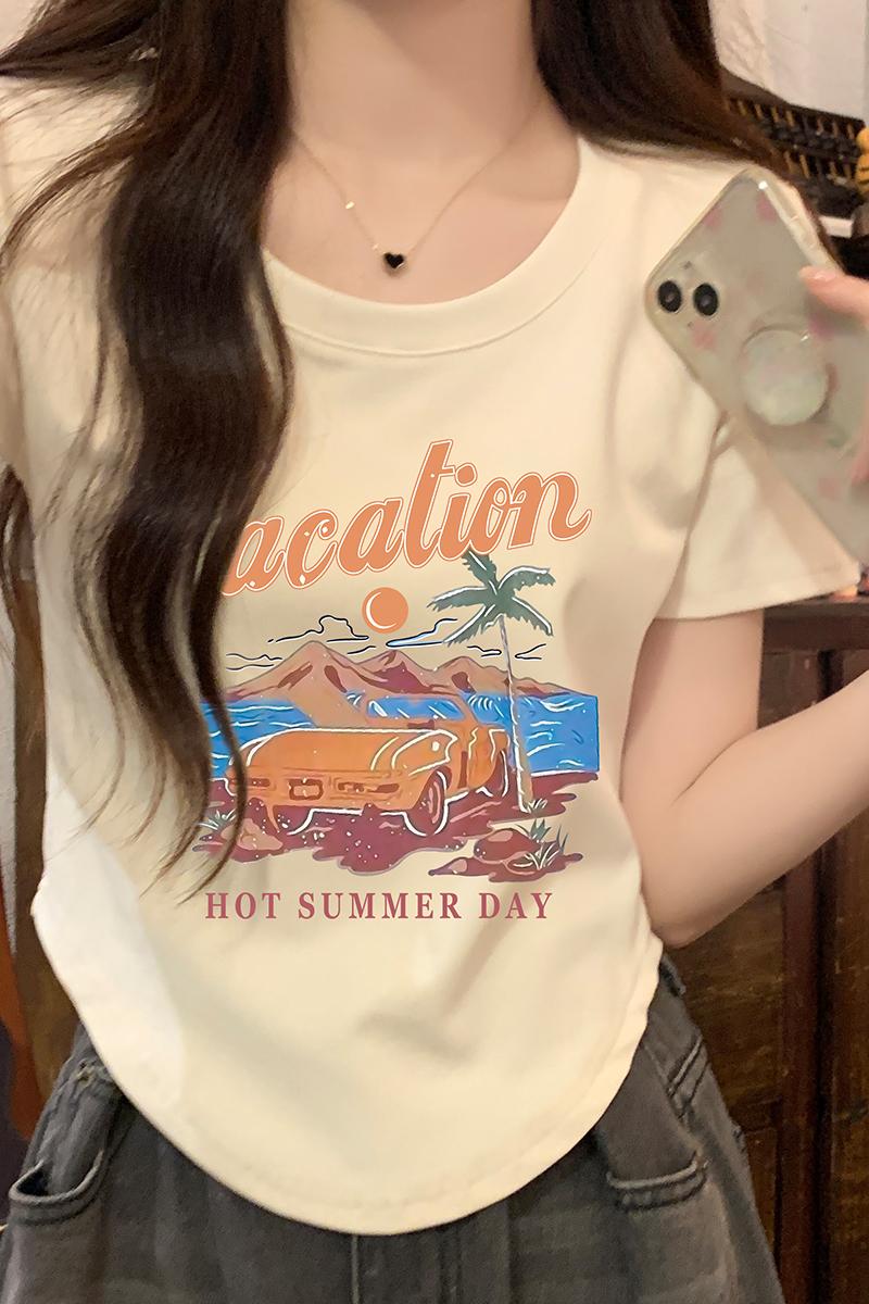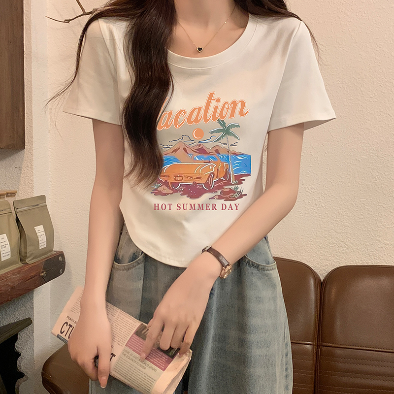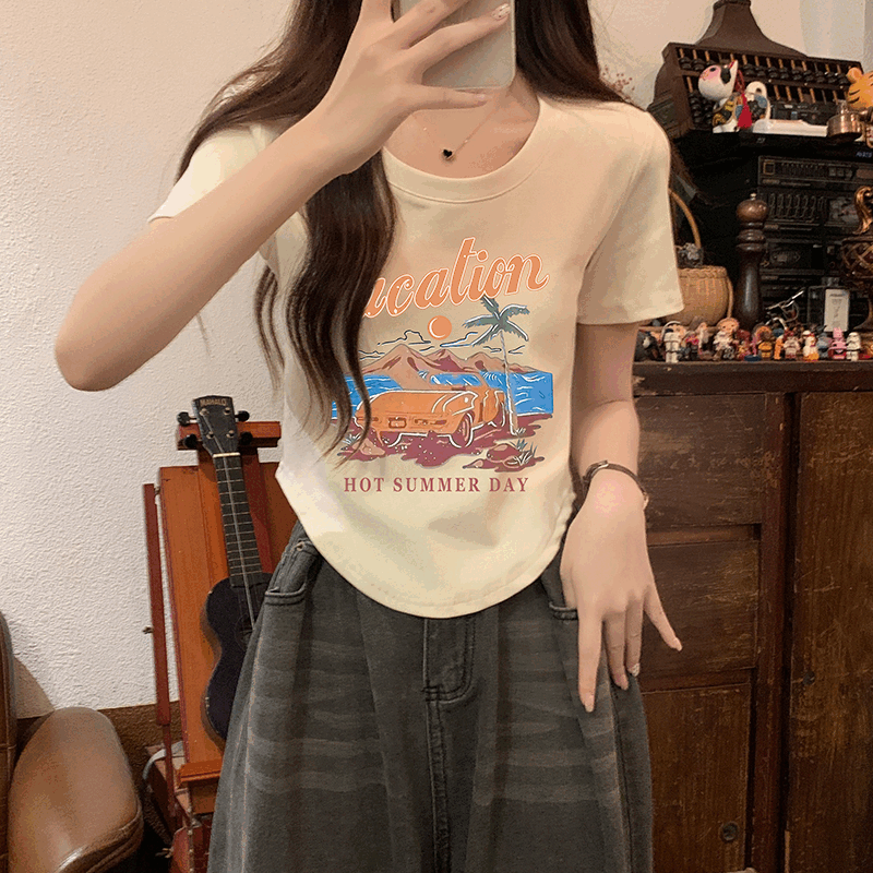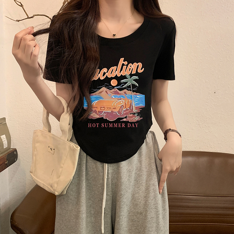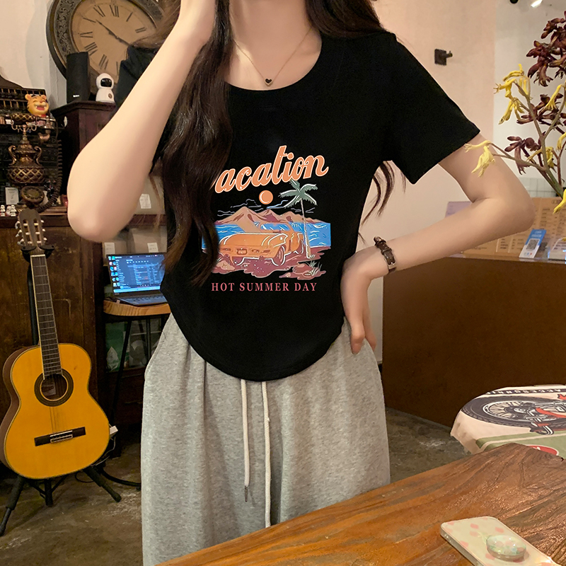 라운드 넥 여름 여름 짧은팔 티셔츠 고급 곡선 밑단 짧은 슬림 하이 허리 배꼽 탑을 가진 여성