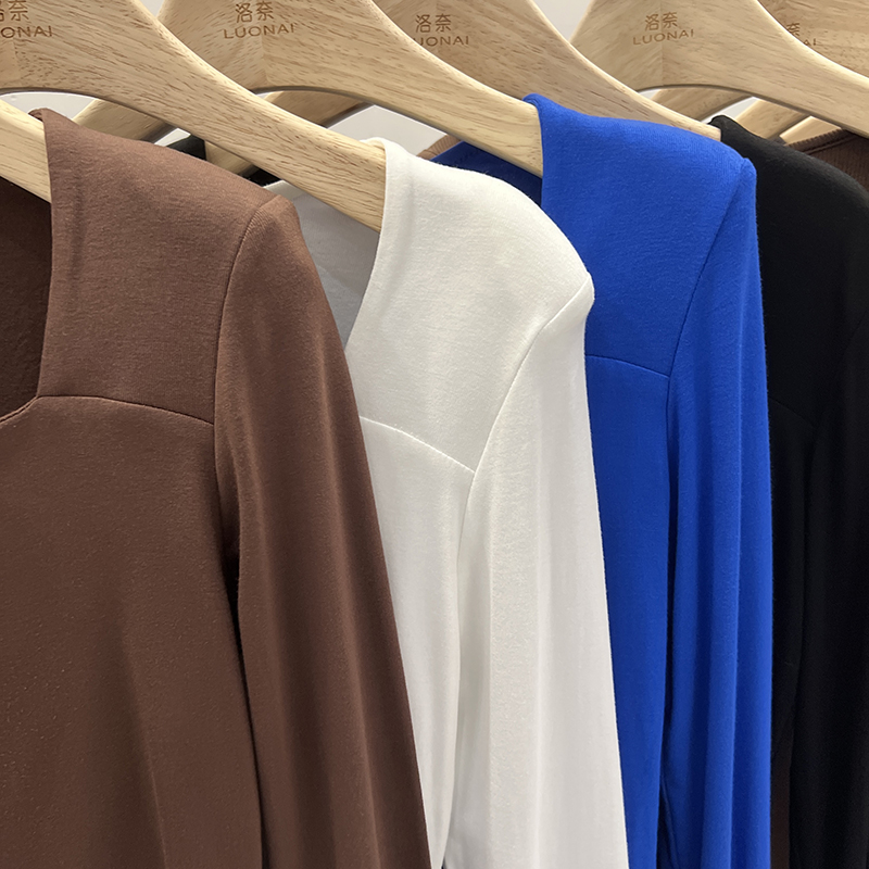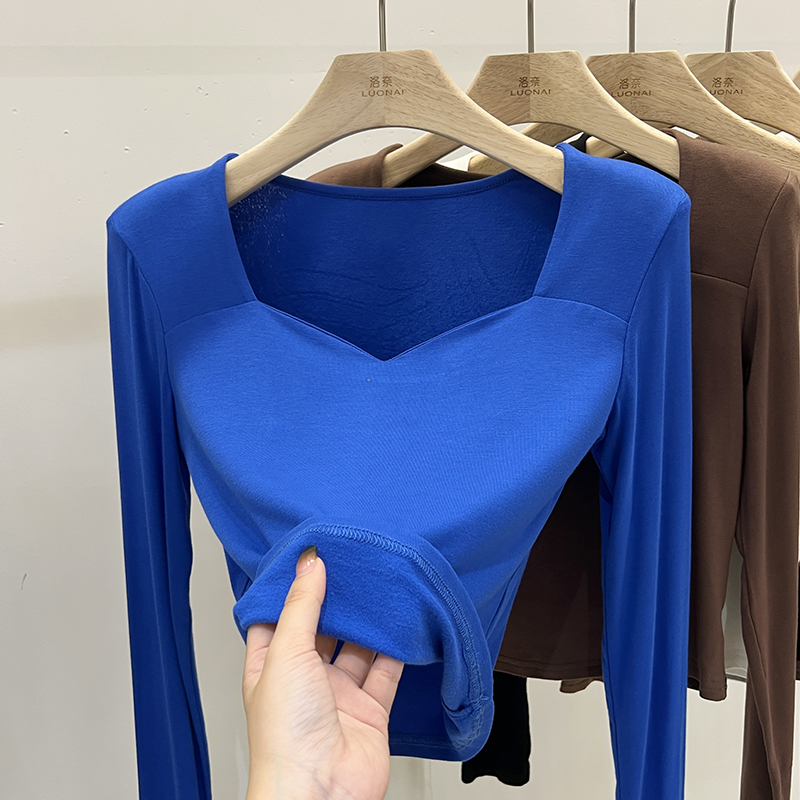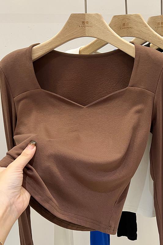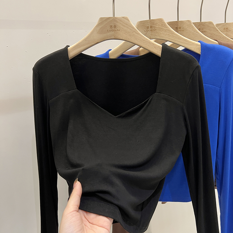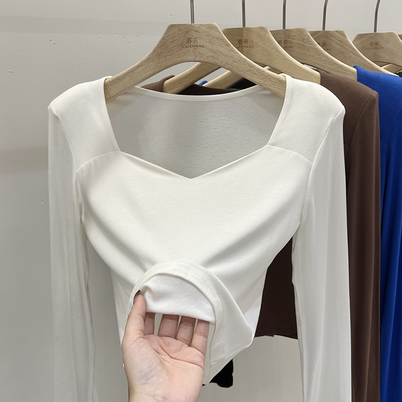 Real-Price Real Shot #Solid Color Slim Collarbone Long-Sleeved T-Shirt, Hairy Women 's Autumn 및 Winter Base Shirt 디자인 및 Fashionable Top