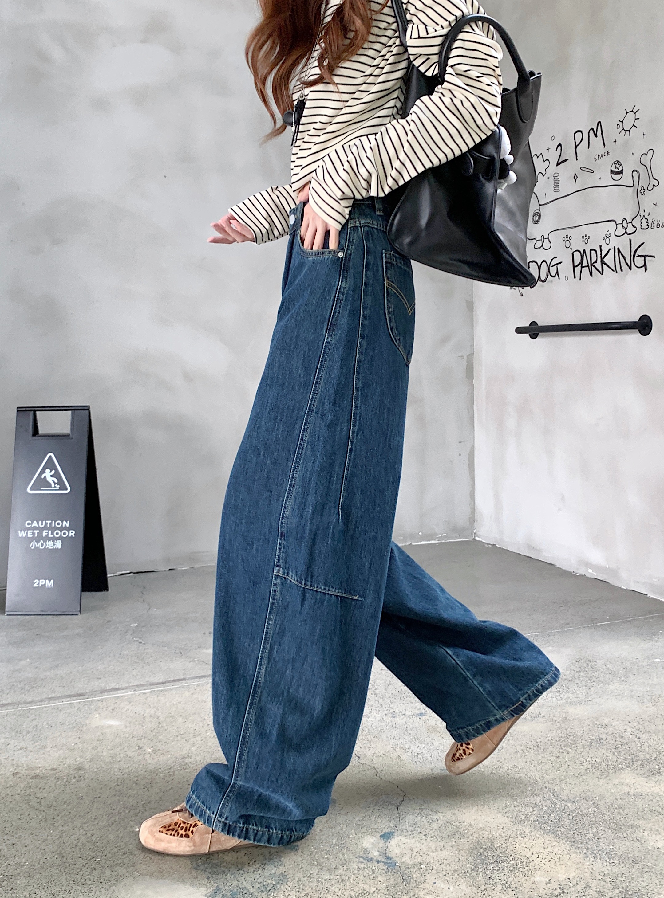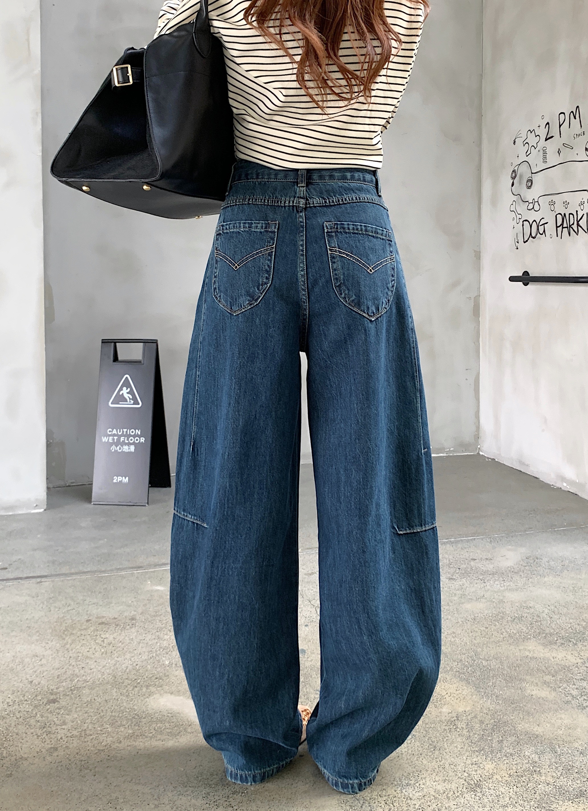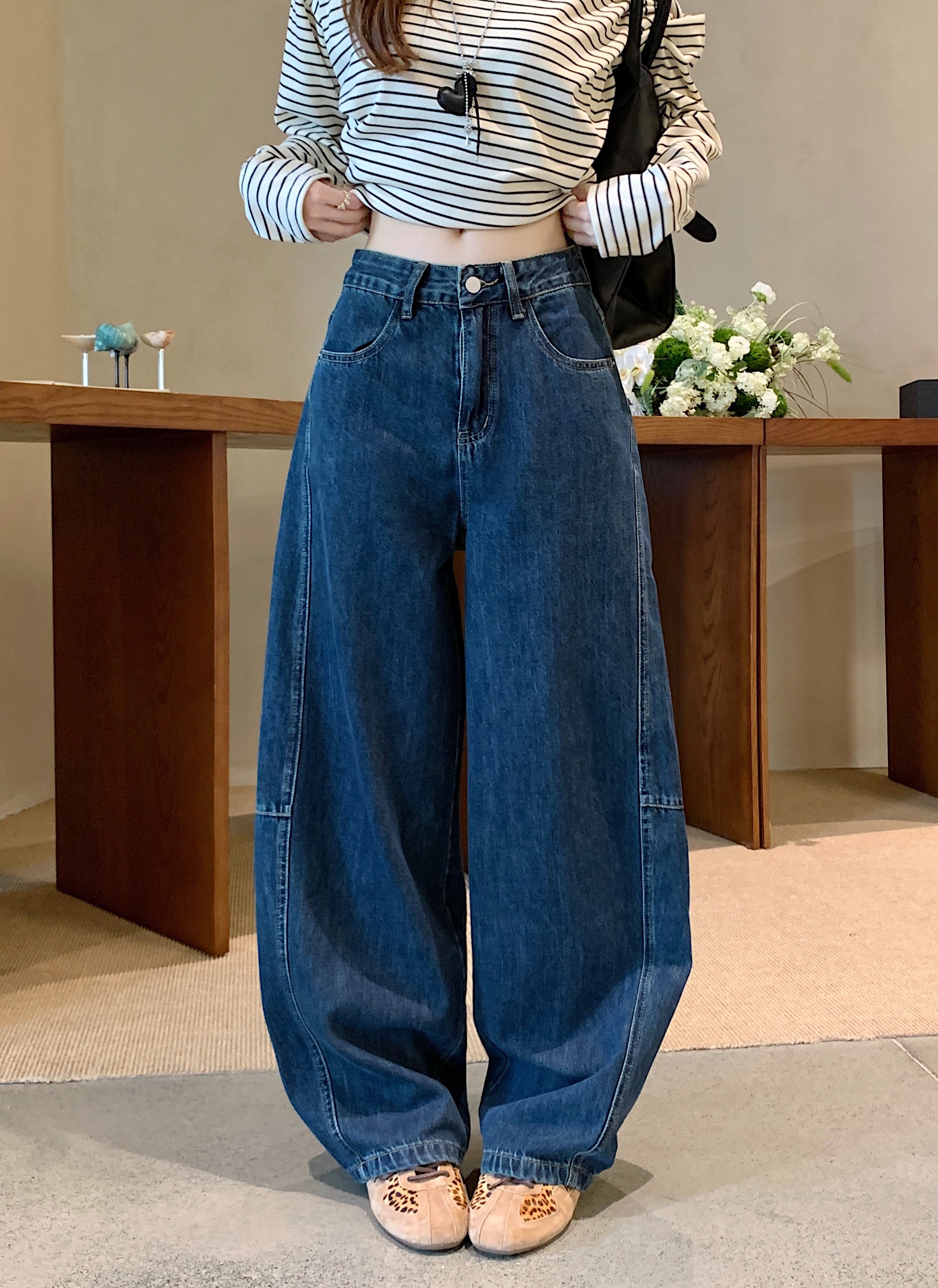 Real Shot, Real Price ~ 여성의 새로운 넓은 다리가 높은 허리 느슨한 슬림 다목적 바지를위한 레트로 블루 Scimitar 청바지