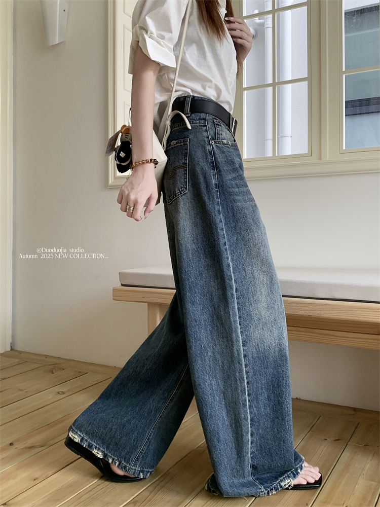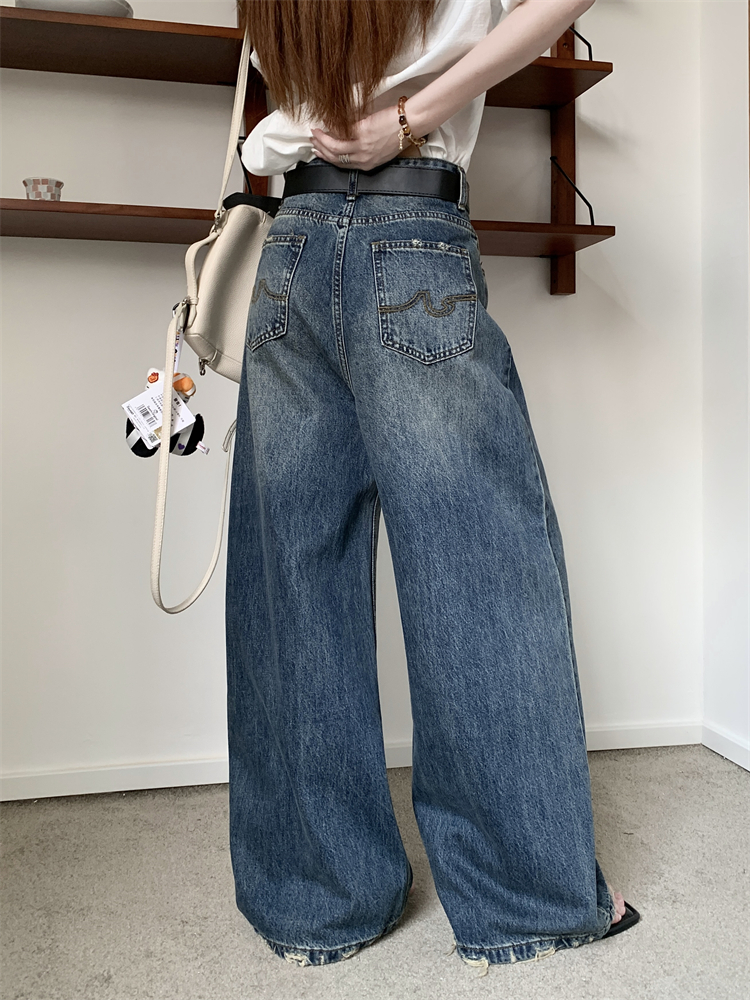 여성의 새로운 하이 허리 슬림 한 스트레이트 레그 바지를위한 실제 미국 레트로 세척 및 찢어진 넓은 다리 청바지
