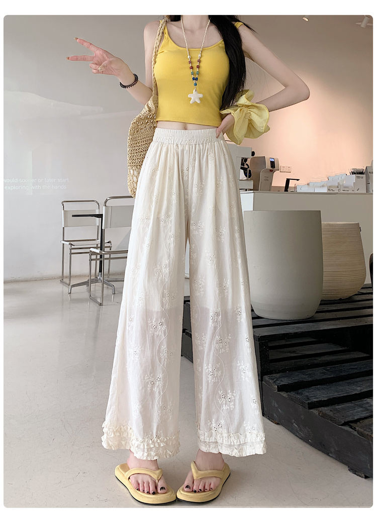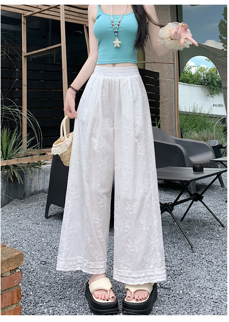 여름에 여성을위한 실제 래스 넓은 다리 바지 새로운 자수 중공 드레이프 느슨한 스트레이트 레그 캐주얼 바지