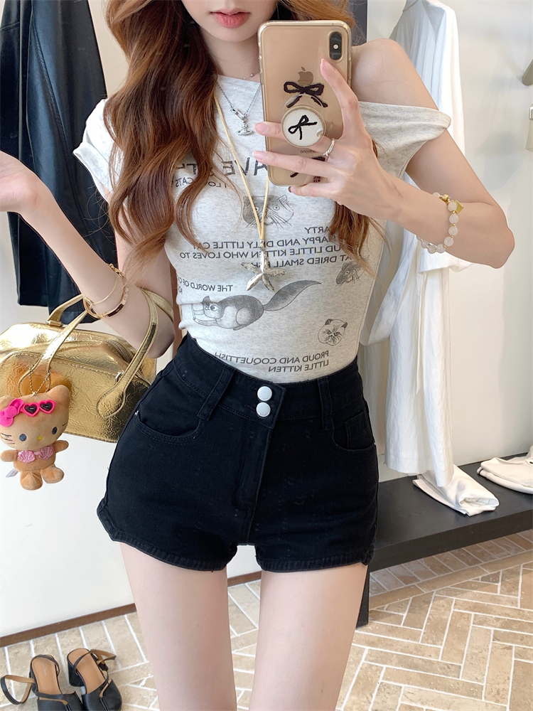 여름 높이 허리 슬림 한 여성을위한 실제 미국 카키색 데님 반바지 더블 버튼 탄성 고관절 핫 바지