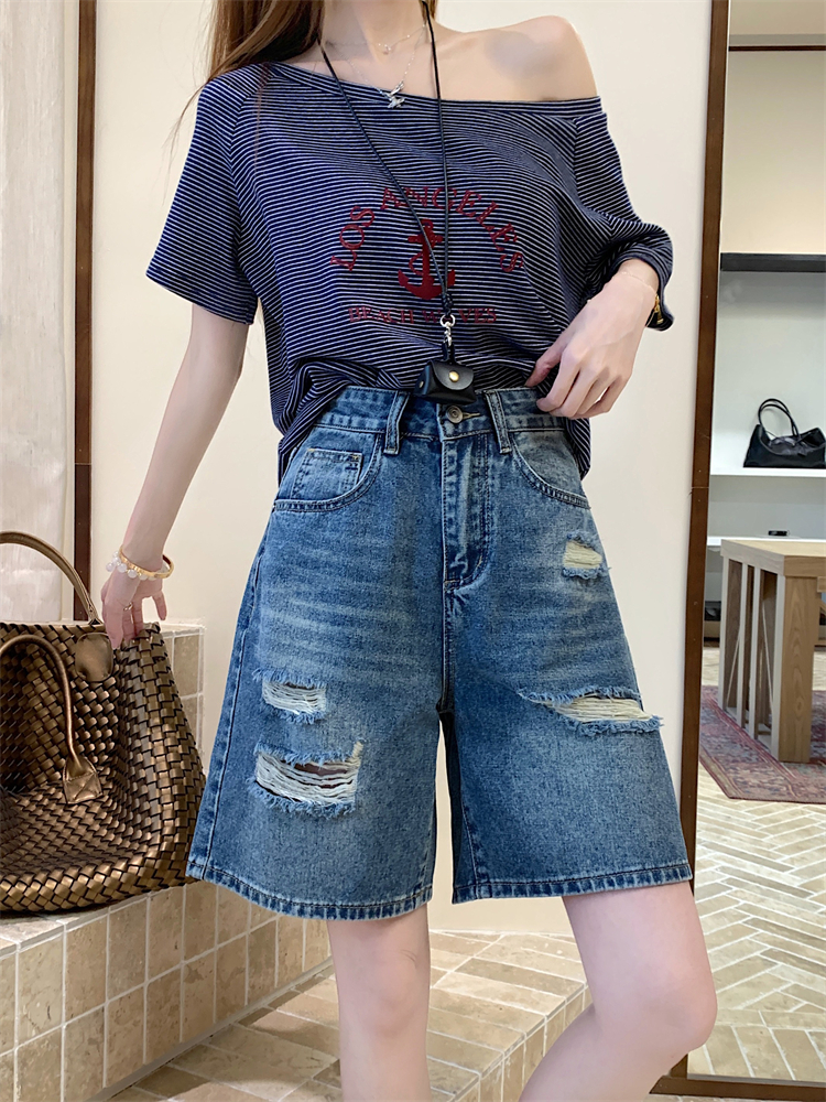 Real Shot, Real Price ~ American Retro는 여성의 새로운 하이 웨이스트 슬리밍 넓은 레그 스트레이트 5 포인트 바지를위한 데님 반바지