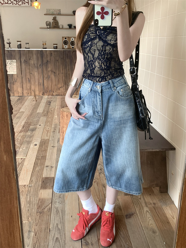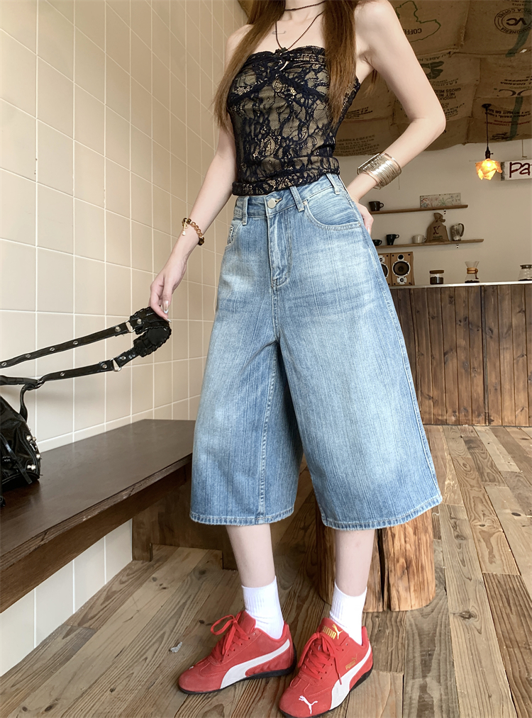 실제 샷, 실제 가격 ~ 여름에 여성을위한 미국 레트로 세척 청바지, 느슨한 넓은 다리 슬리밍 및 다목적 자른 바지 중간 바지