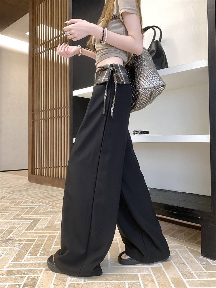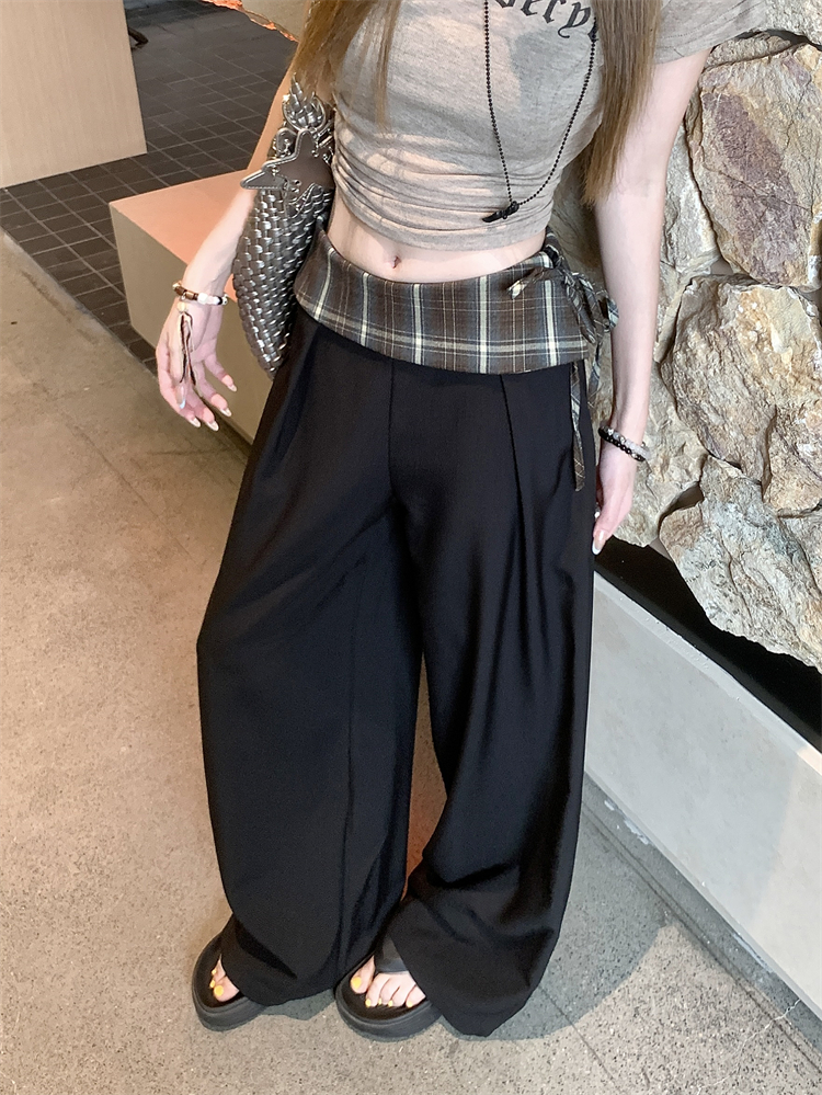실제 사진 및 가격 미국 블랙 격자 무늬 패치 허리 디자인 하이 허리 스트레이트 레그 캐주얼 슈트 바지
