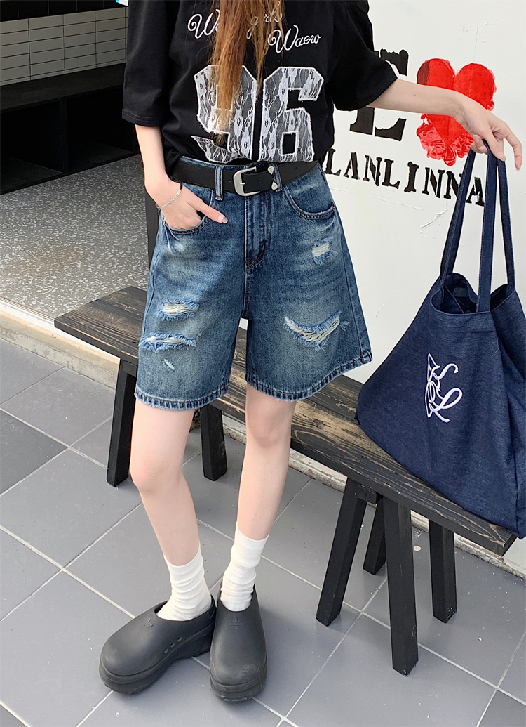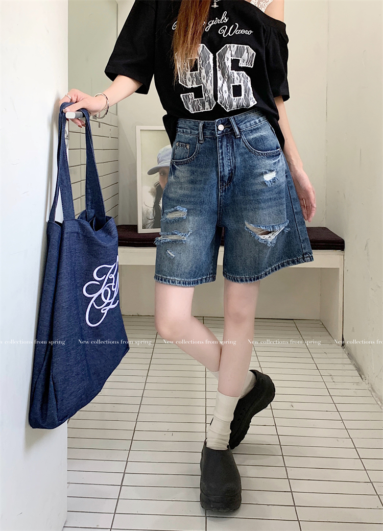 여성의 새로운 하이 웨이스트 느슨한 슬림 한 똑바로 다목적 반바지를위한 실제 저렴한 미국 레트로 찢어진 데님 바지