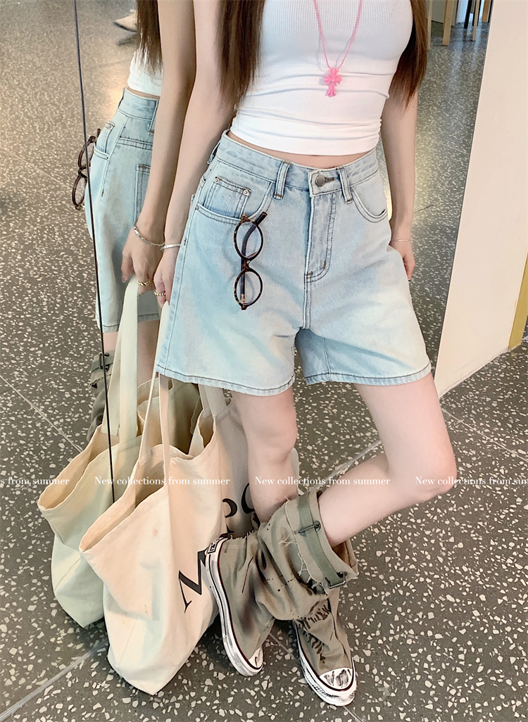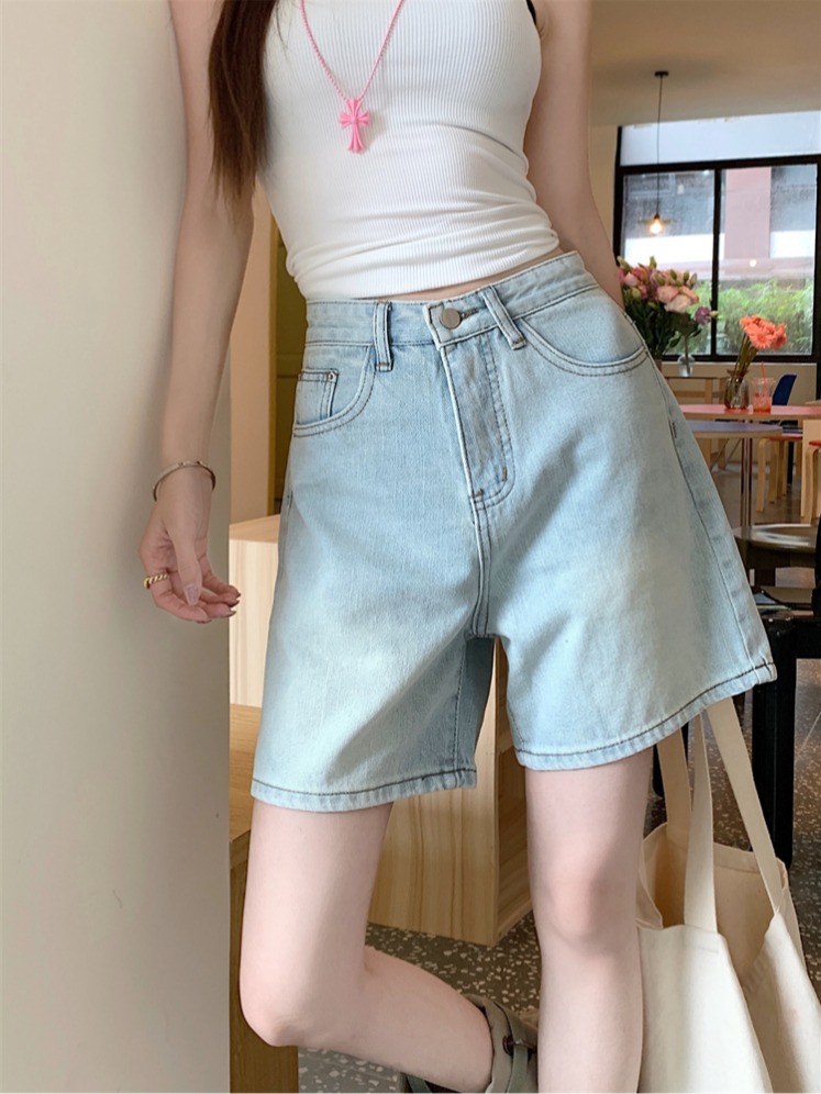 레트로 세척 데님 허리가 높은 여성을위한 5 포인트 바지 느슨한 똑바로 넓은 다리 미드 레그 반바지