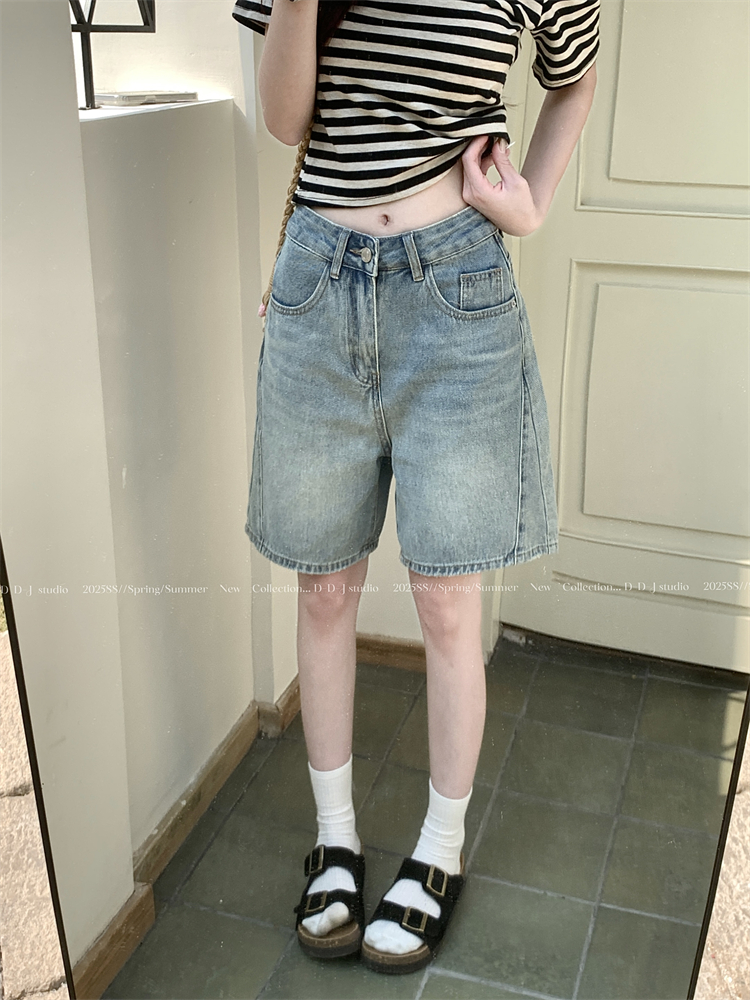 실제 샷과 실제 가격 ~ 레트로 세척 여름 하이 허리 슬림 한 넓은 레그 스 플라이 싱 디자인 반바지에서 5 점 데님 소녀
