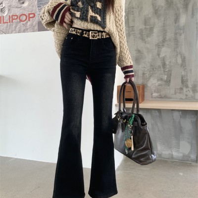 허리 슬림하고 작은 다재다능 플레어 바지를 가진 여성을위한 미국 레트로 청바지