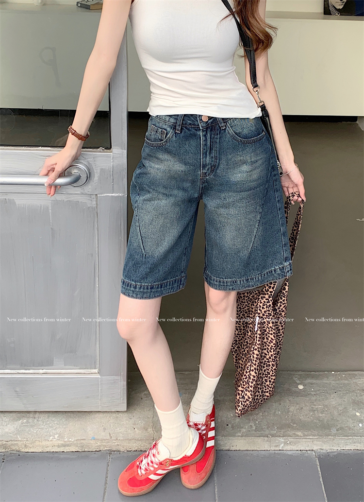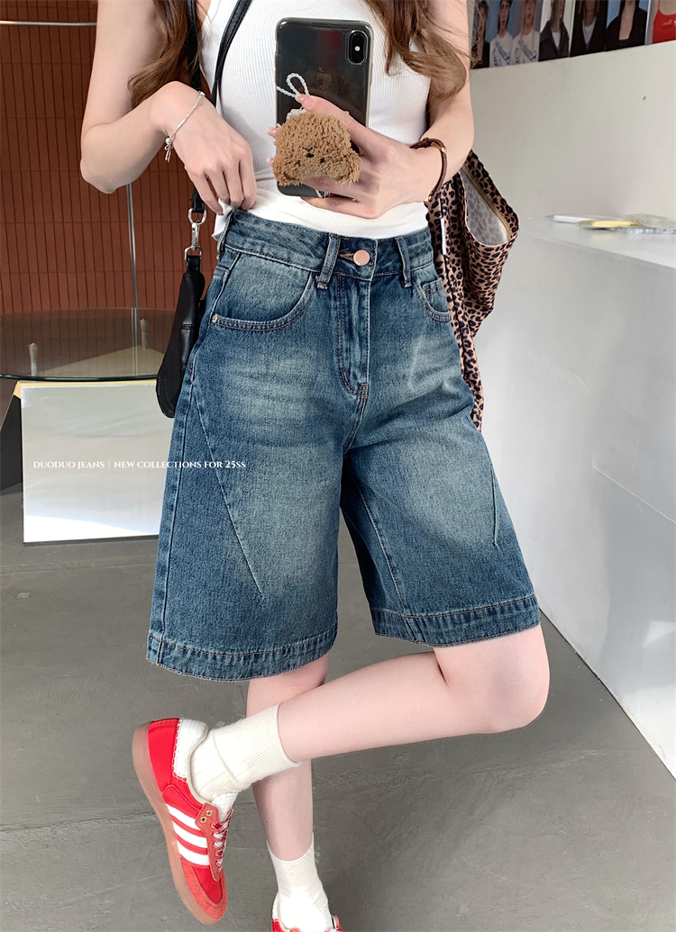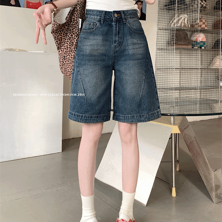 실제 샷과 실제 가격 ~ 레트로 핫 걸 크롭 바지 드레임 반바지 여성 고무 느슨한 디자인 스트레이트 넓은 다리 미드 레그 바지
