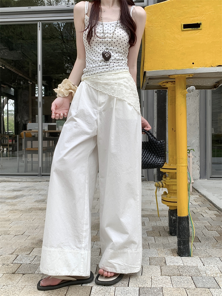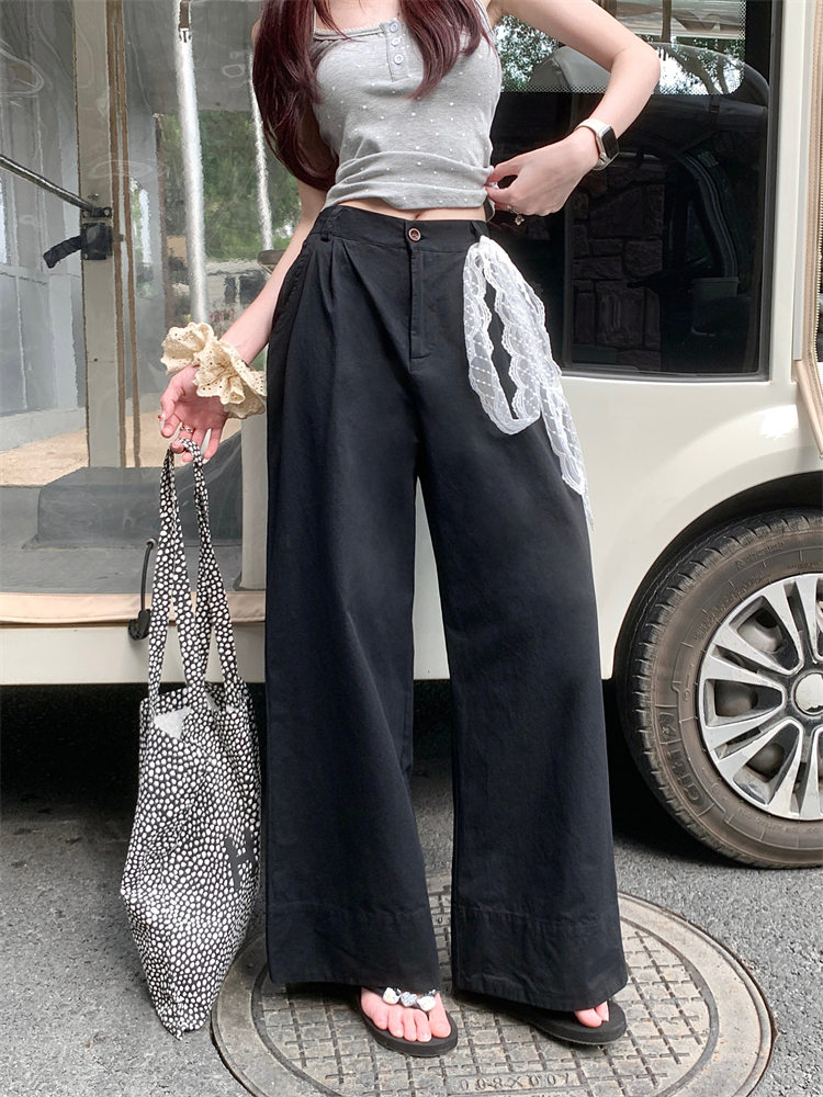 새로운 한국 버전의 느슨한 세척 면화 넓은 다리 캐주얼 바지가 높은 허리 다목적 슬림 한 직선 바지를 가진 여성.