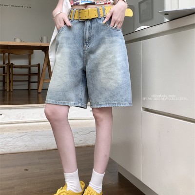 레트로 워시 라이트 블루 데님 미드 팬츠 여름 새로운 스타일 오래된 스트레이트 반바지 5 점 바지
