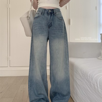 실제 미국 레트로 레이스 스 플라이 싱 디자인 허리가있는 여성을위한 넓은 다리 청바지, 슬림 한 직선 바닥 바지가