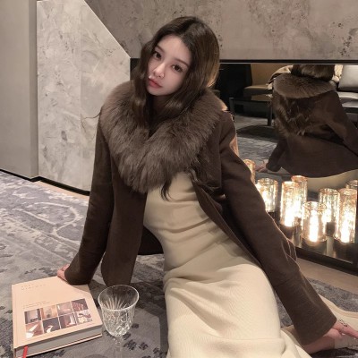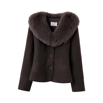 중년 vintage 레트로 커피 색상 여우 머리 모피 칼라 허리 털이 많은 코튼 자켓