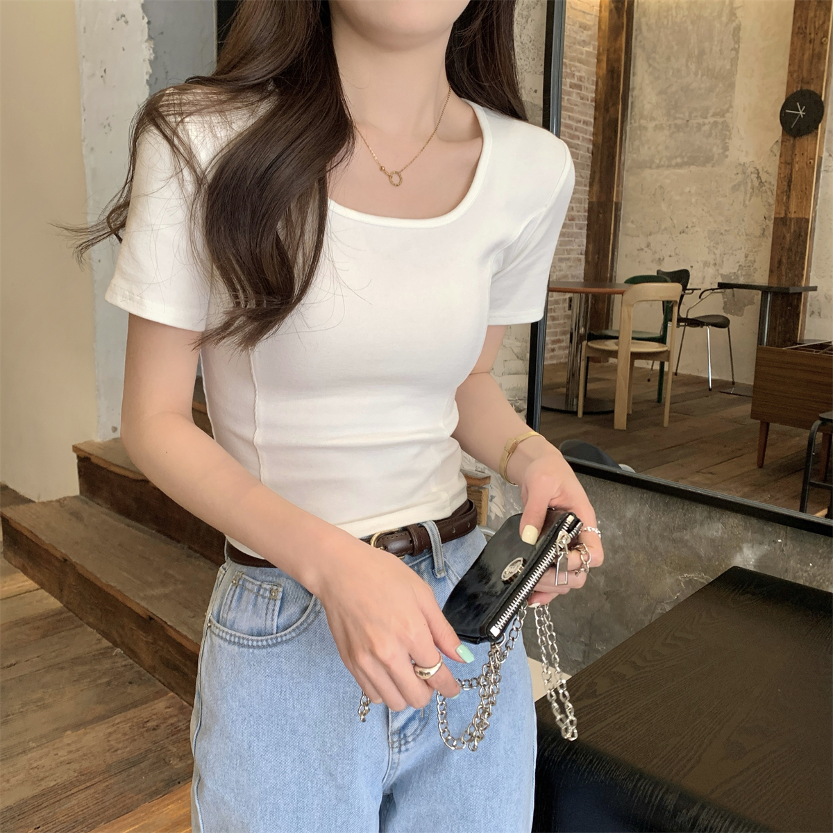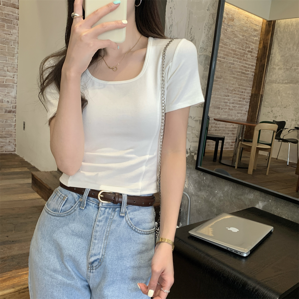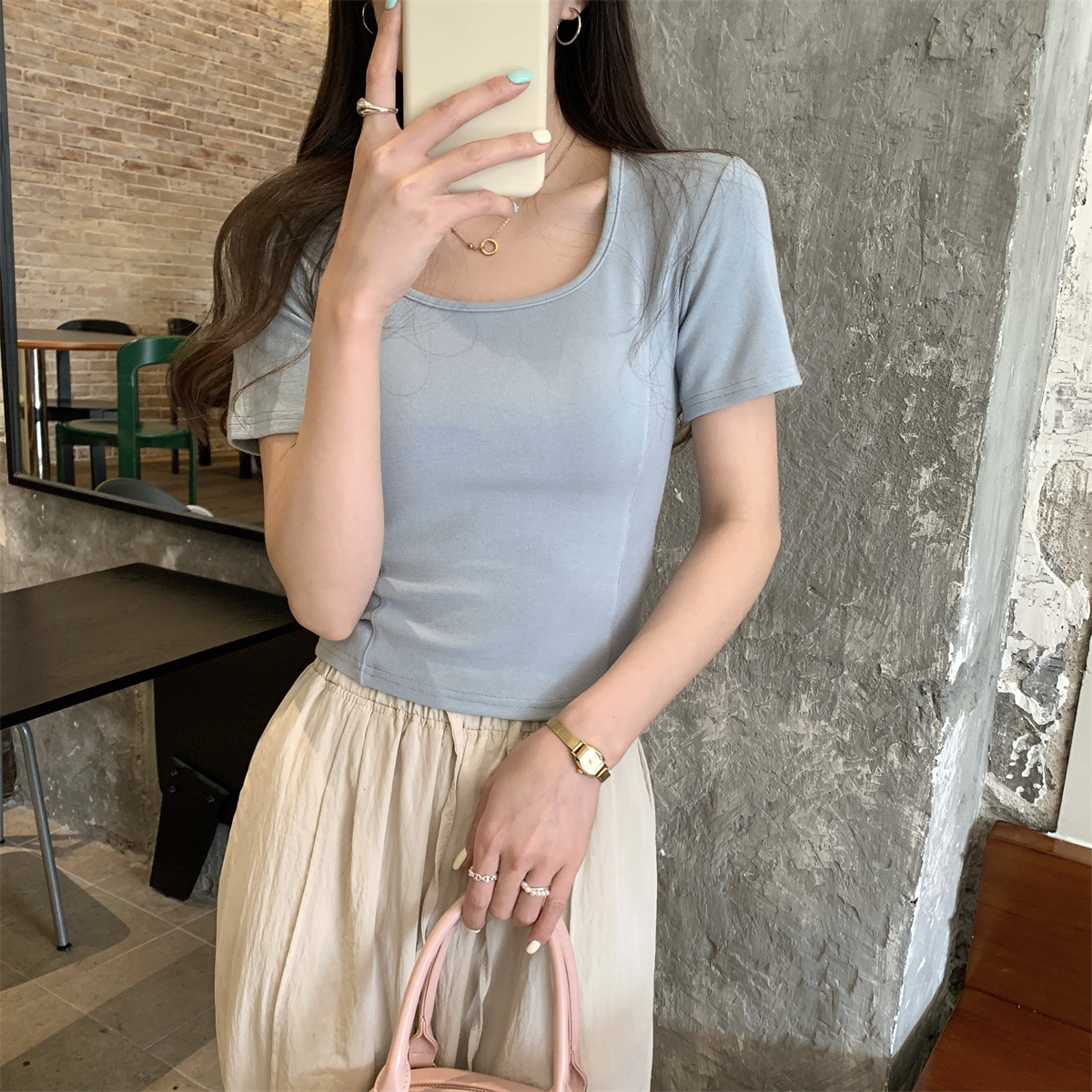 실제 주사 및 여름 한국 스타일 하프 하이리 칼라 구덩이 스트립 중공 드로 스트링 슬리밍 니트 짧은 슬리트 탑