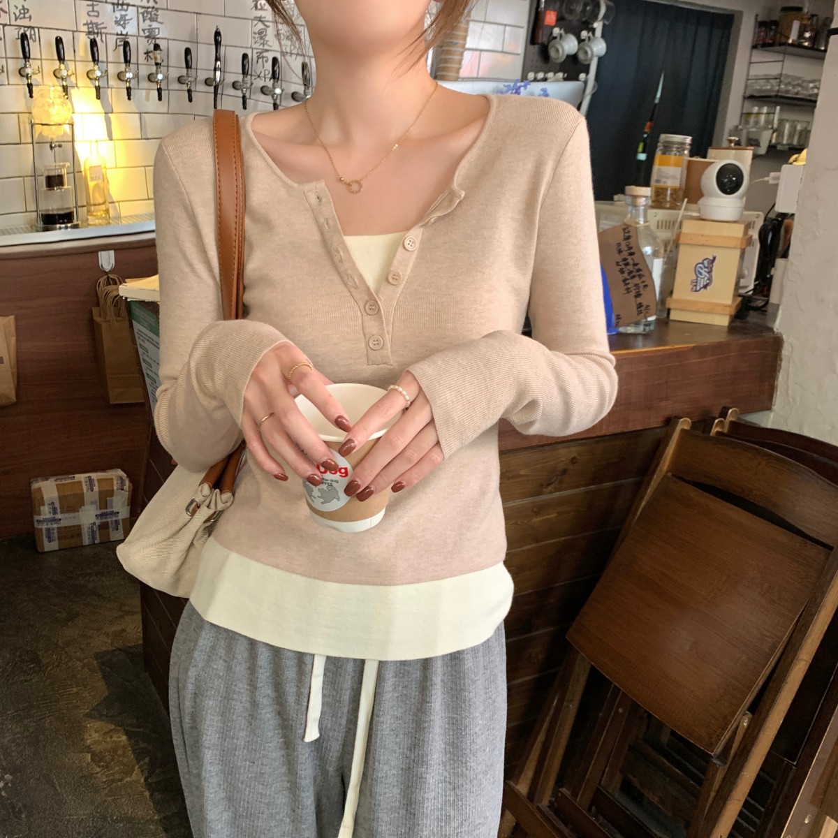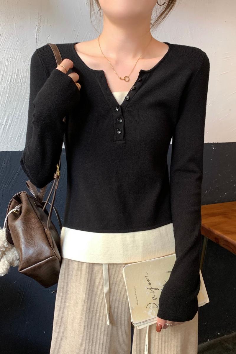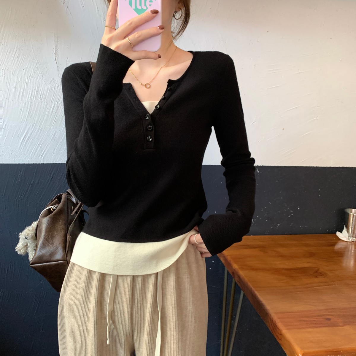 실제 사진 가을 및 겨울 한국의 슬림 한 내부 페어링 제곱 목 가짜 2 피스 대조 디자인 니트베이스 스웨터