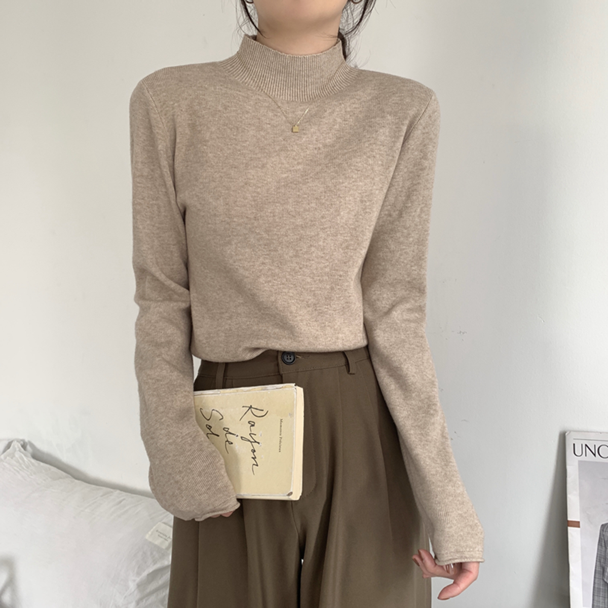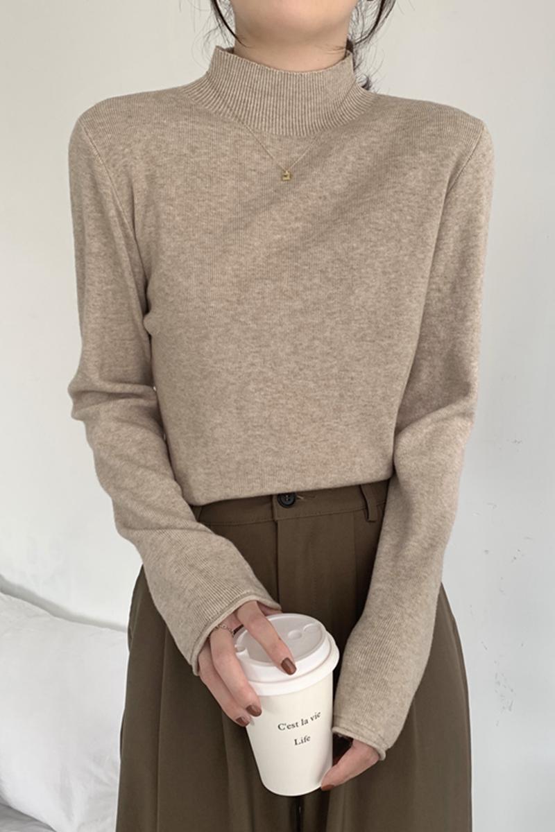 실제 사진 검은 귀와 생선 뼈 디자인이있는 반 높이의 . 슬림 한 니트베이스 스웨터