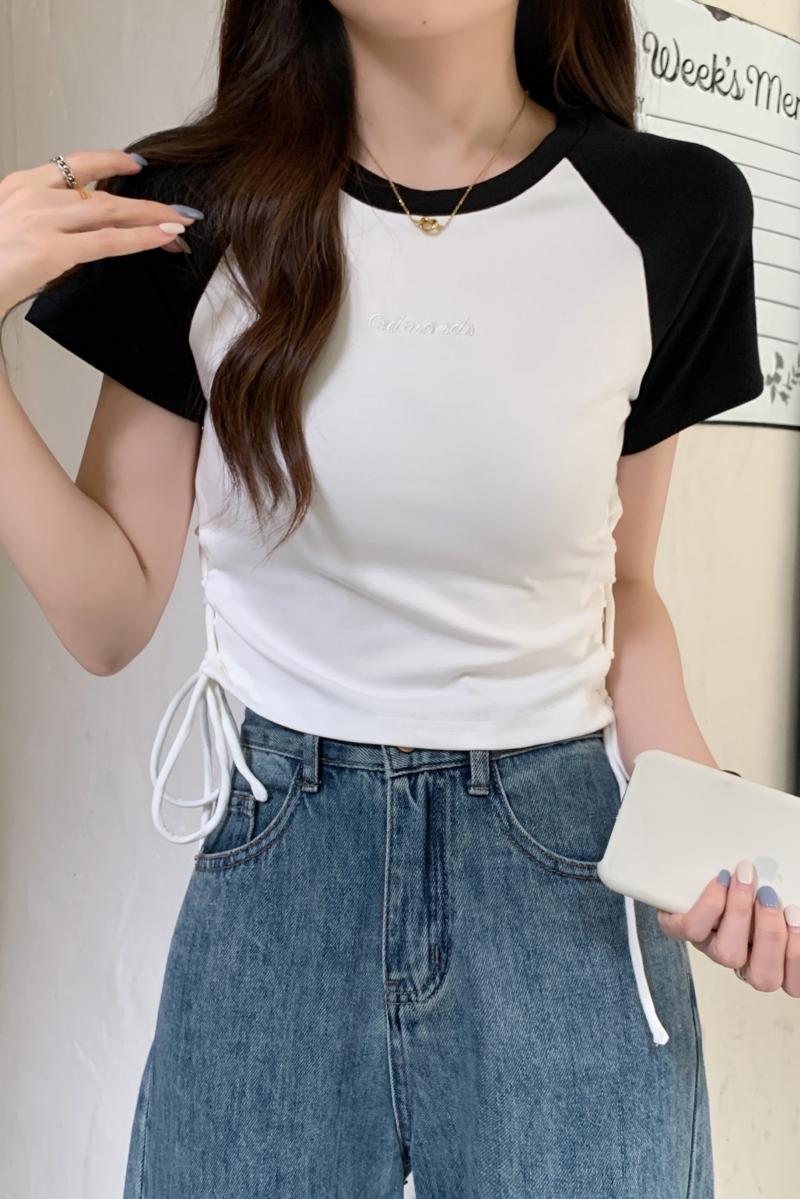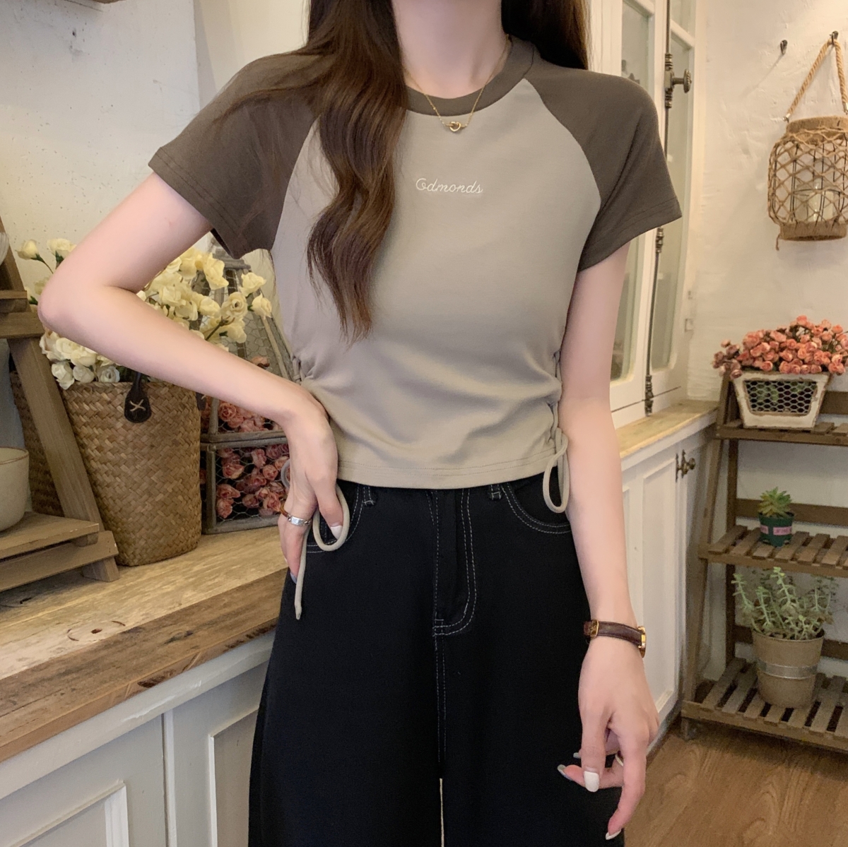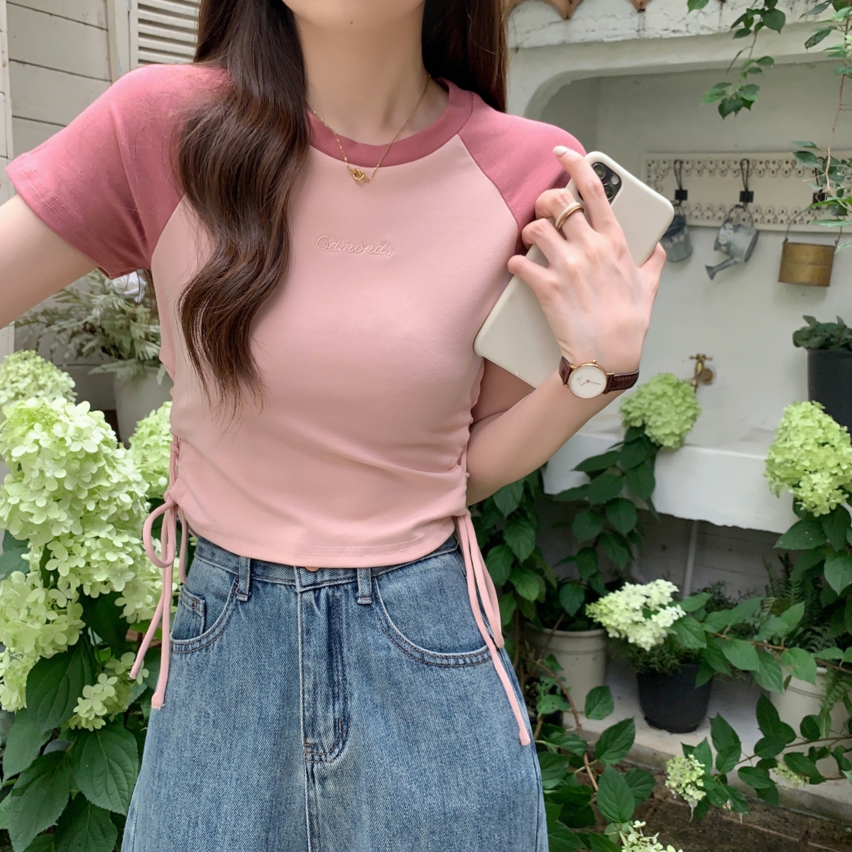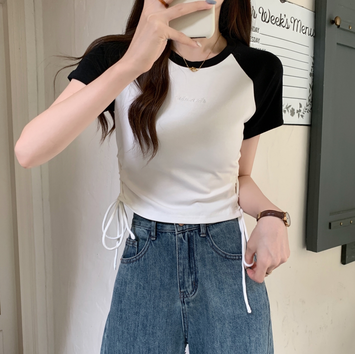 실제 사진 및 여름 한국 스타일 프랑스 스퀘어 넥 대비 디자인 다목적 니트 짧은 슬리브 여성 탑