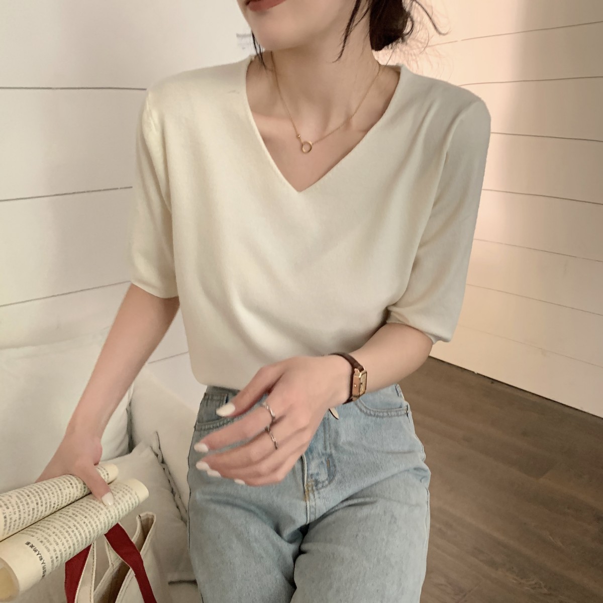 봄 여름 한국 스타일 슬림 대조 대조 Ragdoll Sleeve Design 단축 다목적 티셔츠 여자 탑