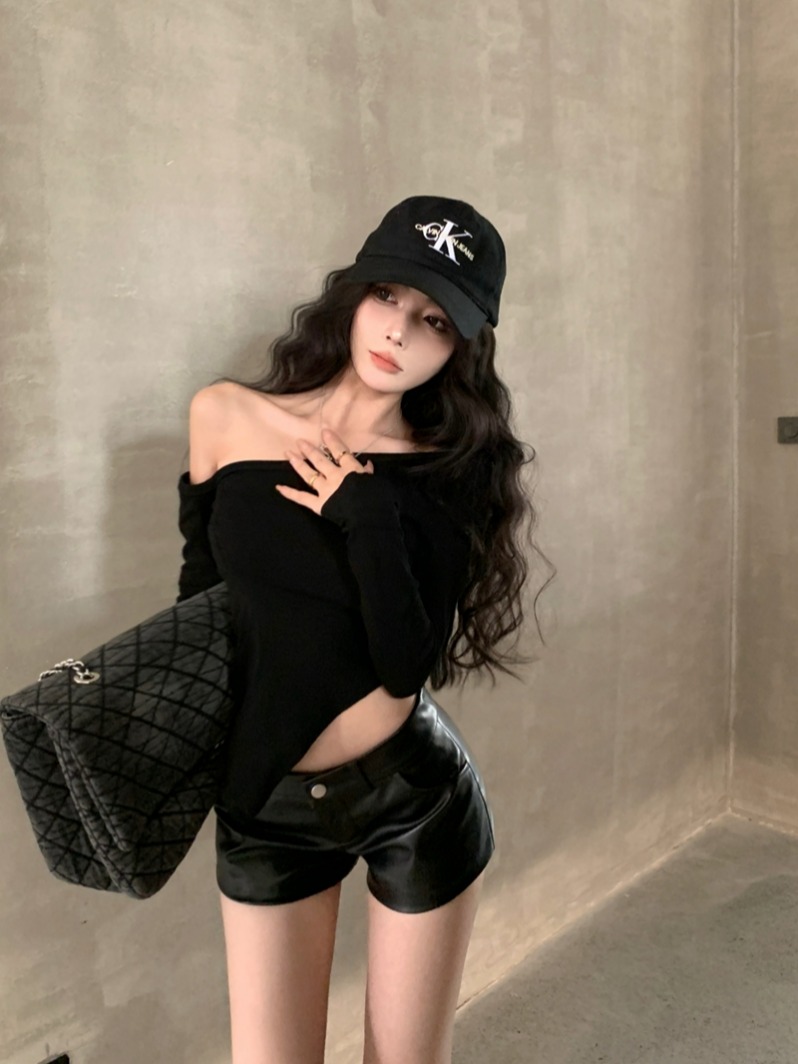 실제 가격 초기 가을 순수 욕망 스타일 불규칙한 검은 색 오프 숄더 긴팔 티셔츠 슬림하고 슬림 한 뜨거운 소녀의 경사 어깨 탑