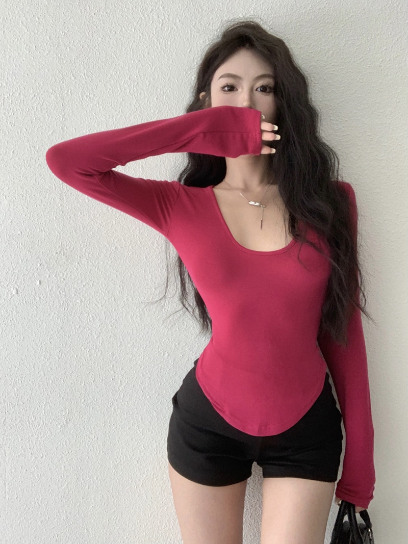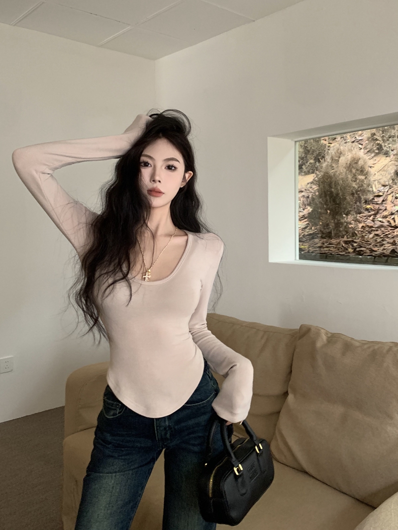 실제 봄 봄 핫 걸 스타일 허리 껴안기 및 슬림 한 U-Neck 긴팔 티셔츠 슬림하고 탄성적 인 가슴 보이는베이스 셔츠