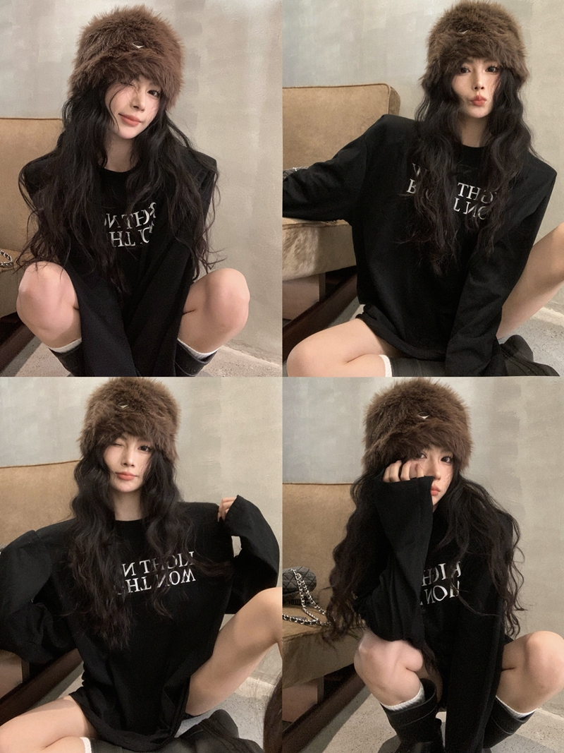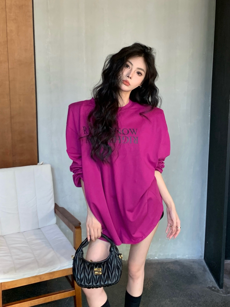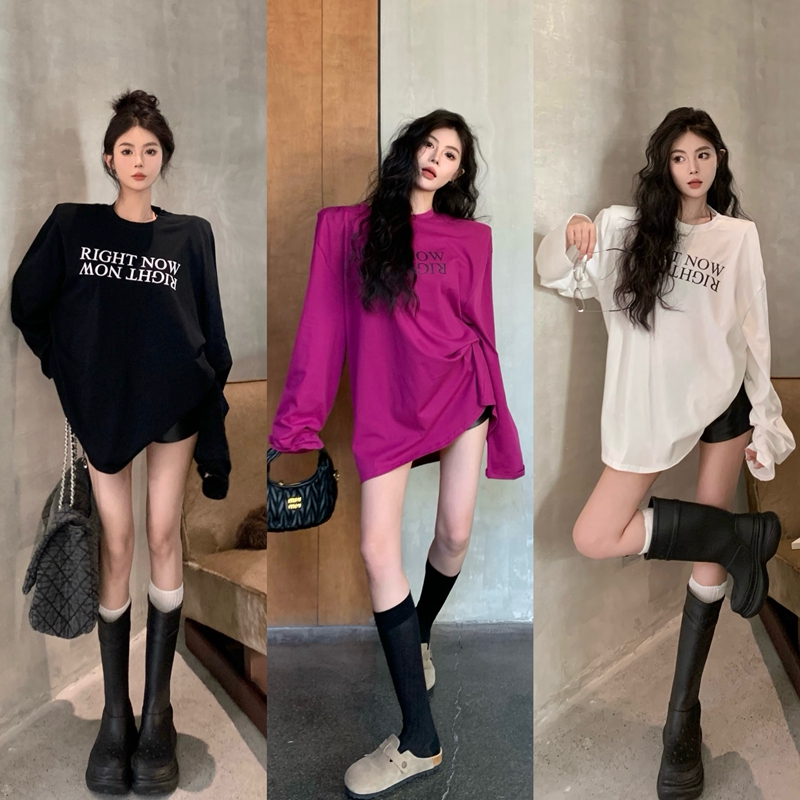 실제 봄 스프링 핫 소녀 스타일 편지 인쇄 캐주얼 느슨한 어깨 패드 긴 슬리브 티셔츠 여자 와이드 버전 최고의 트렌디