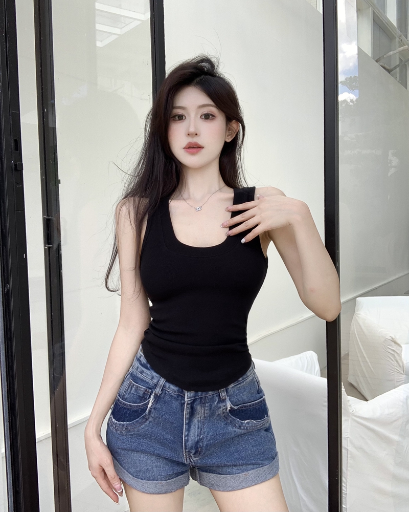 섹시한 핫 걸 스타일 화이트 서스펜더 조끼는 슬림 한 핏과 민소매 짧은 상단
