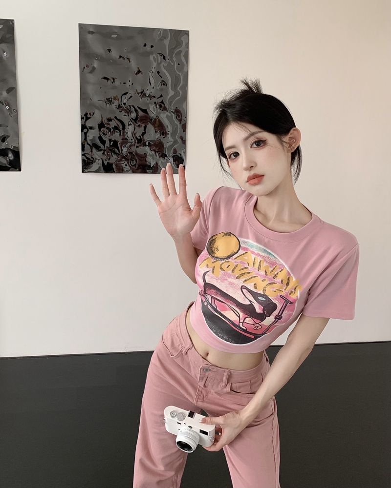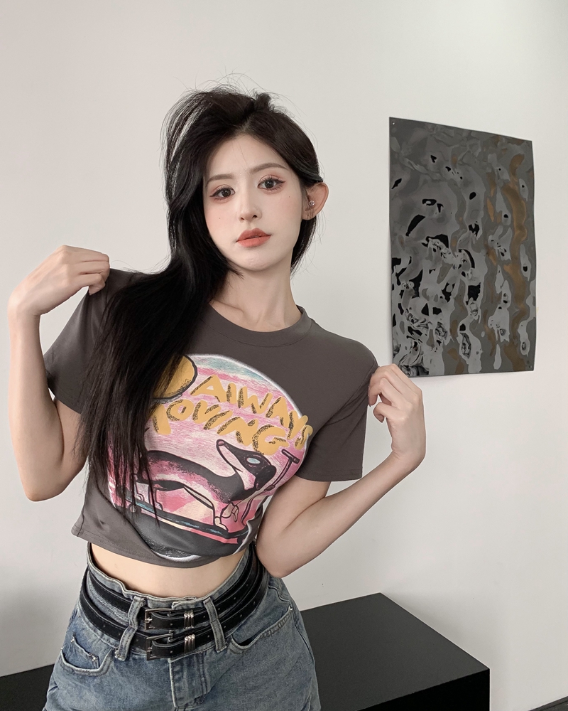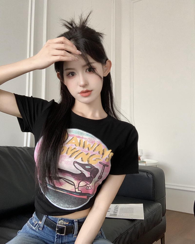 여름 핫 소녀 재미있는 편지 강아지 인쇄 짧은 짧은 슬리브 티셔츠 ins 슬리밍 및 배꼽 꼭대기