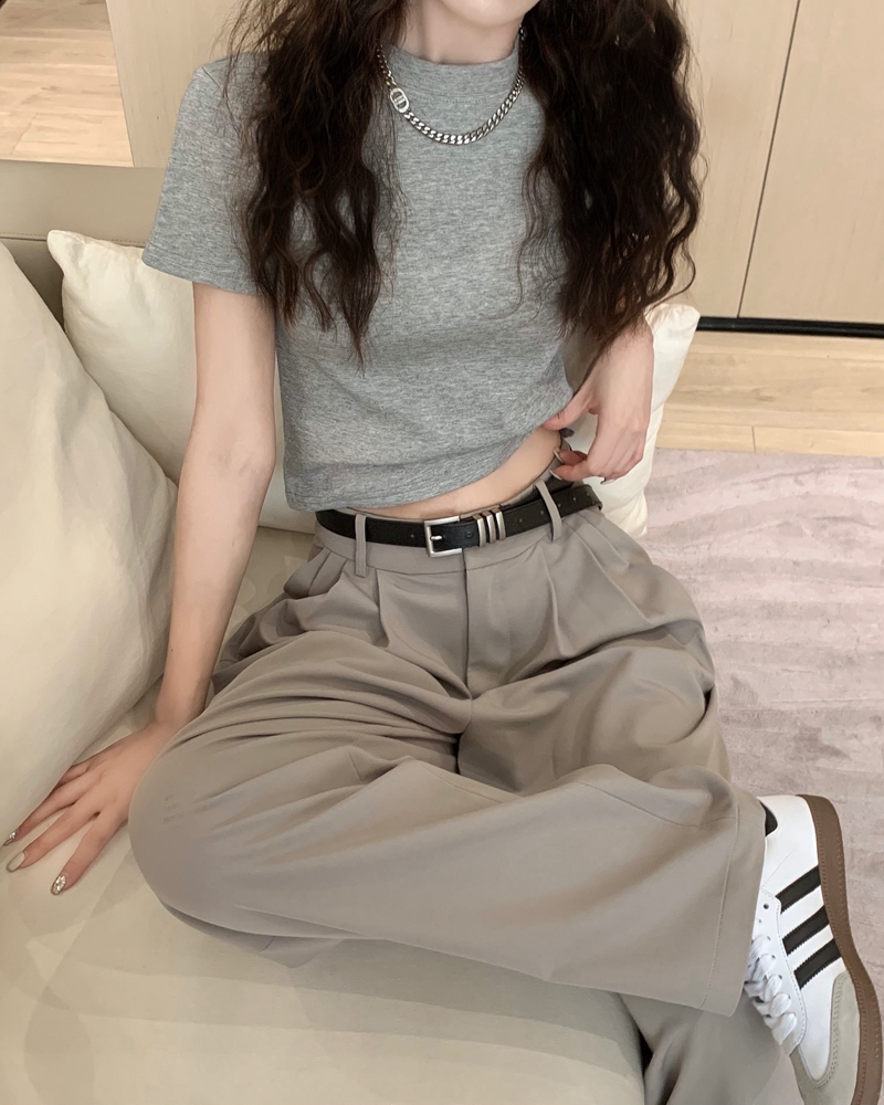 여름의 실제 샷 새로운 단순하고 다재다능한 슬림 짧은 핫 소녀베이스 단색 단락 티셔츠