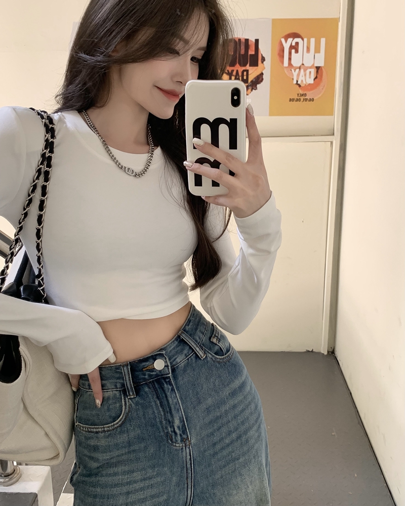 겨울 홍콩 핫 걸 스타일 슬림 한 짧은 배꼽 노출 긴 소매 어깨 패드 티셔츠 ins 등이없는 내부 벨벳베이스 셔츠