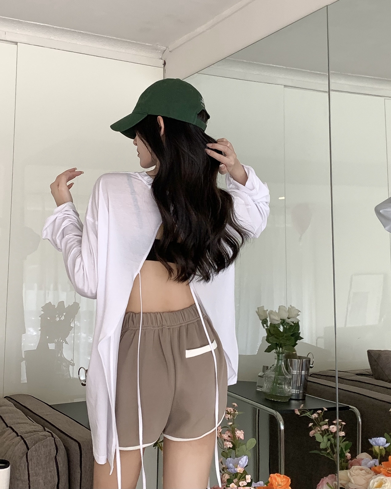 여름 홍콩 스타일의 실제 사진 섹시한 등이없는 얇은 얇은 긴 슬리브 선 스크린 티셔츠 in back strap ice-sensing top