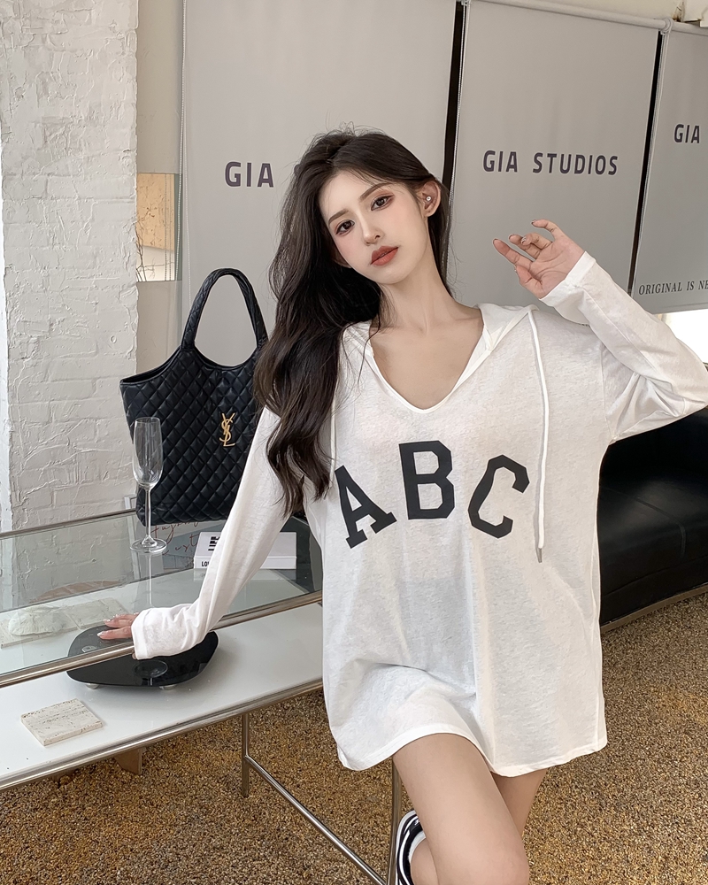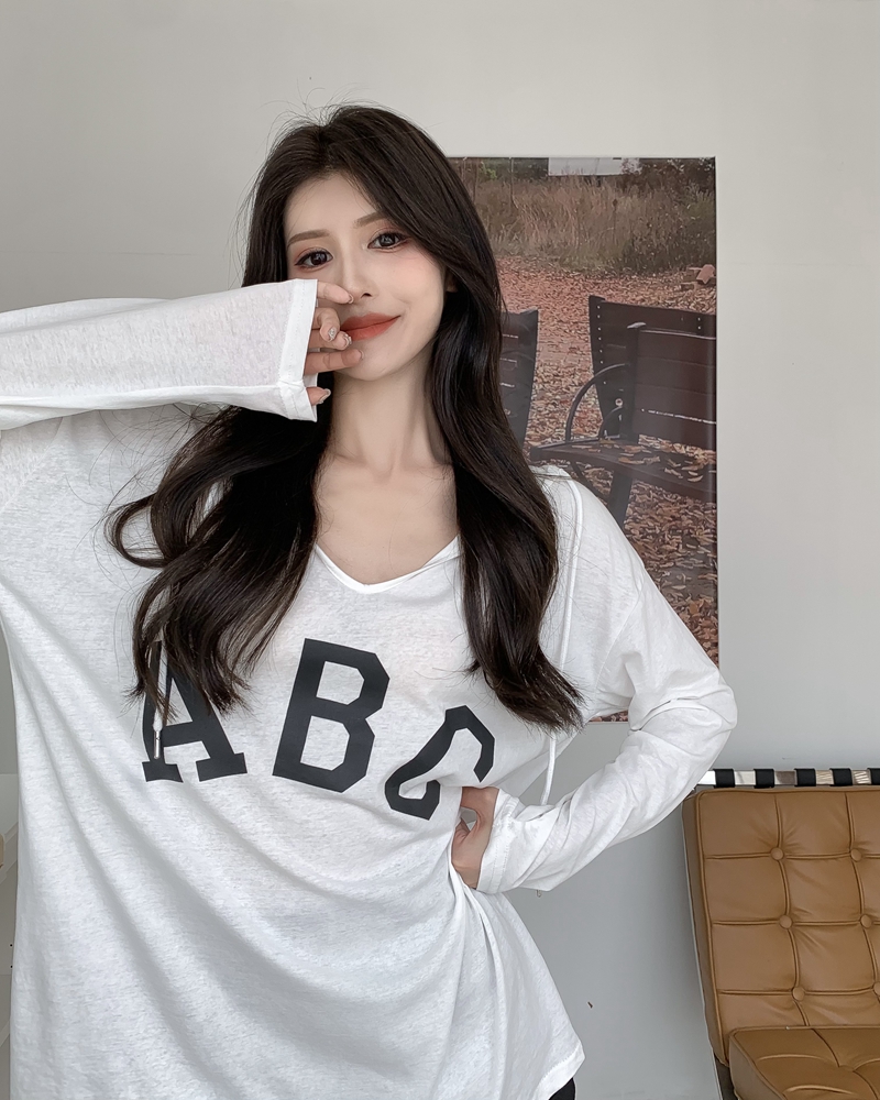 여름 홍콩 스타일의 진짜 사진 얇은 느슨한 긴팔 후드 선 스크린 셔츠 인쇄 게으른 스타일 티셔츠 탑