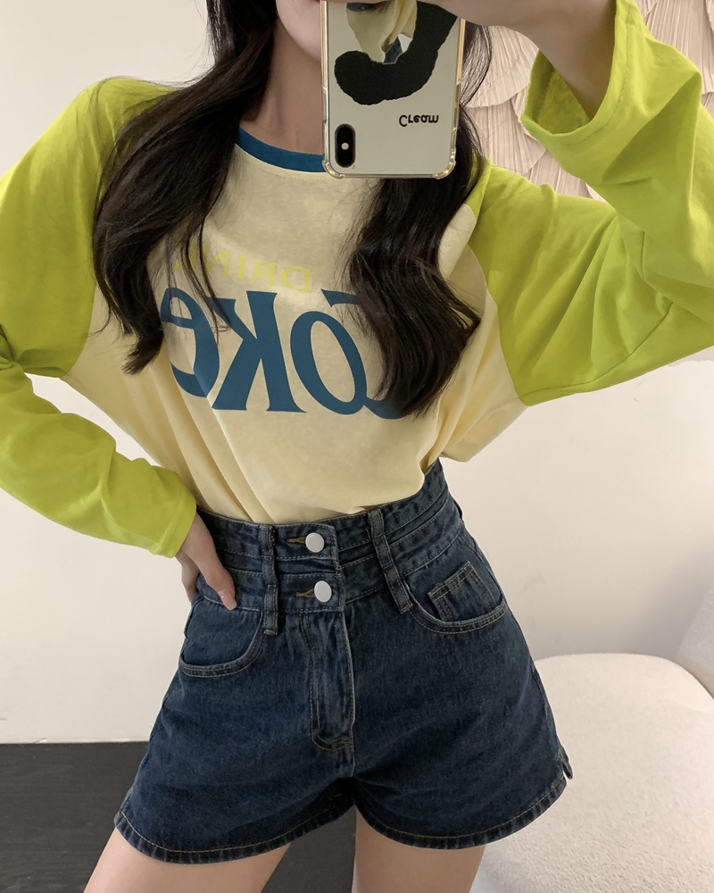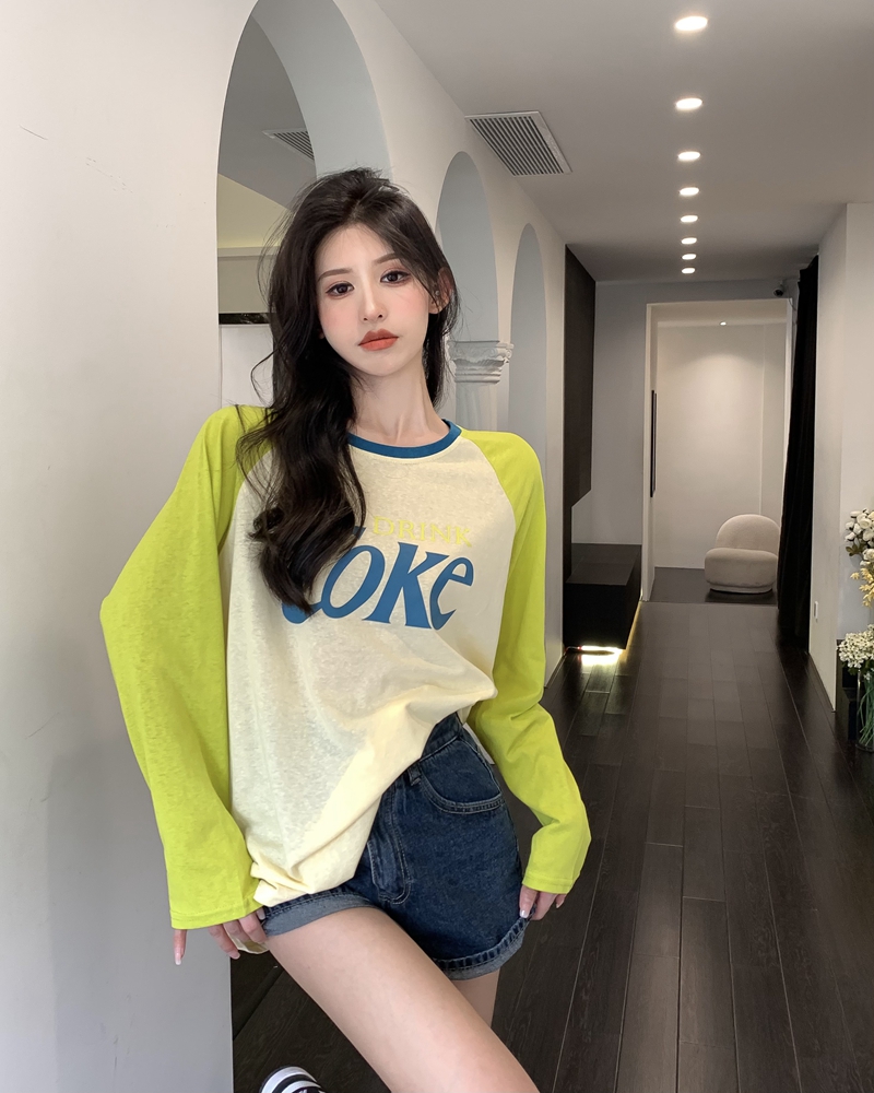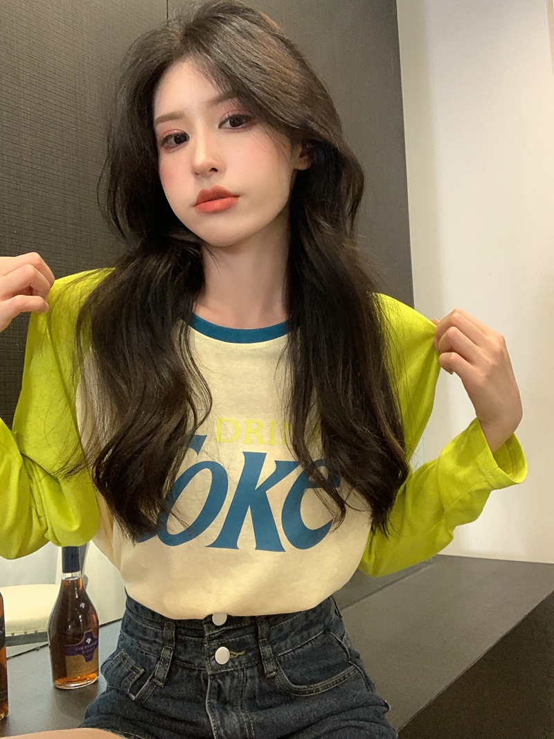 여름 홍콩 스타일의 실제 사진 세련된 편지 인쇄 대조 컬러 래그 졸 소매 느슨한 긴 슬리브 티셔츠 in 얇은 선 스크린