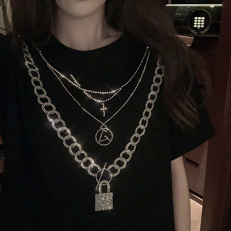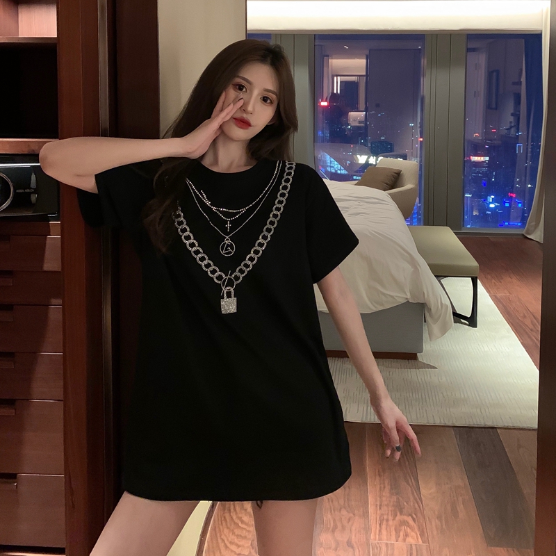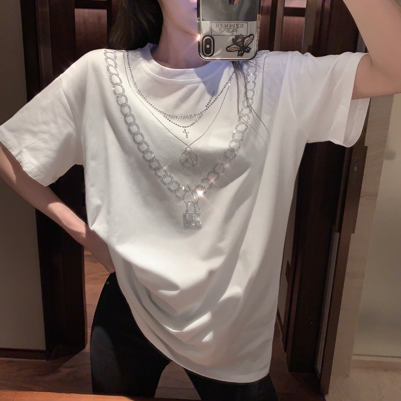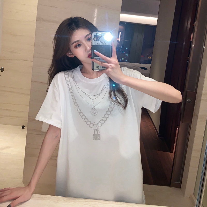 새로운 여름 스타일의 실제 사진 홍콩 스타일의 세련된 플래시 다이아몬드 쿨 코튼 느슨한 짧은팔 티셔츠 나이트 클럽 디스코 탑 트렌디