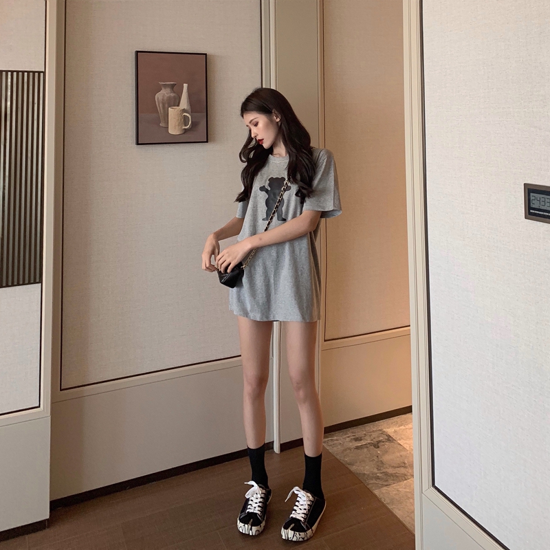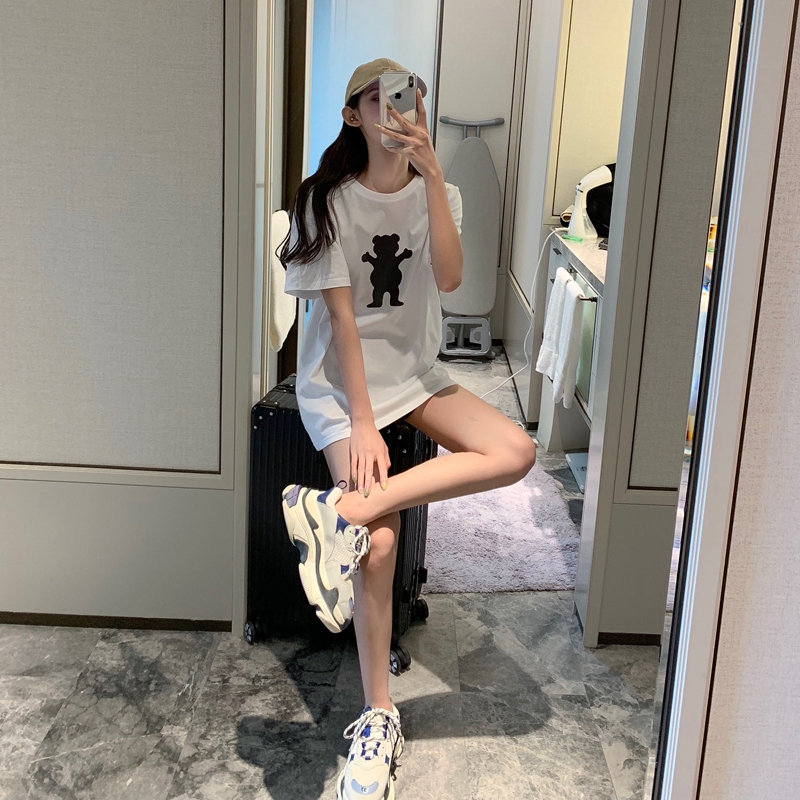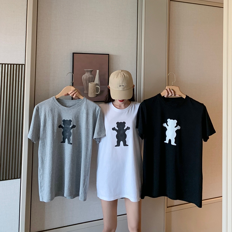 여름의 실제 사진 뉴 홍콩 스타일의 티셔츠 여자 짧은 슬리브 한국 만화 베어 ins 느슨한 BF 스타일 커플의 반팔 티셔츠 트렌디
