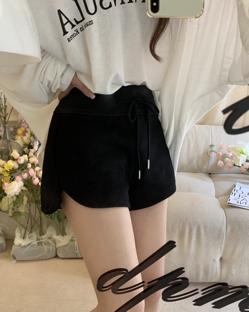 여름 홍콩 스타일의 실제 샷 여성을위한 회색 스포츠 바지 느슨한 허리 드로 스트링 캐주얼 스트레이트 레그 반바지 트렌디