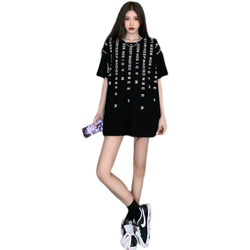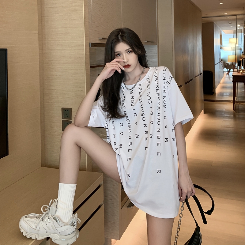 여름 홍콩 스타일의 실제 사진 레트로 게으른 느슨한 편지 인쇄 스키닝 스키닝 백 중공 가짜 2 피스 짧은 슬리브 티셔츠 트렌디